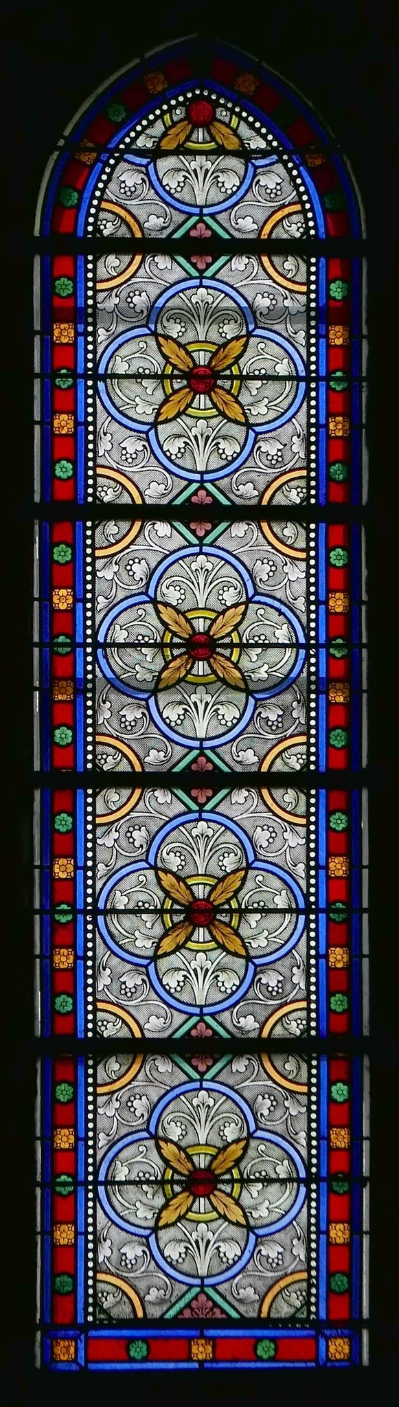 Spitzbogenfenster, das mit sich wiederholenden geometrischen Motiven (blaue Vierpässe, gelbe Kreise und grüne stehende Vierecke), Grisaillemalerei (Blüten- und Blattranken) und einem schmalen, blütenbesetzten Rahmen in Blau und Rot gestaltet ist (identisch mit n X, s IX und s XI).