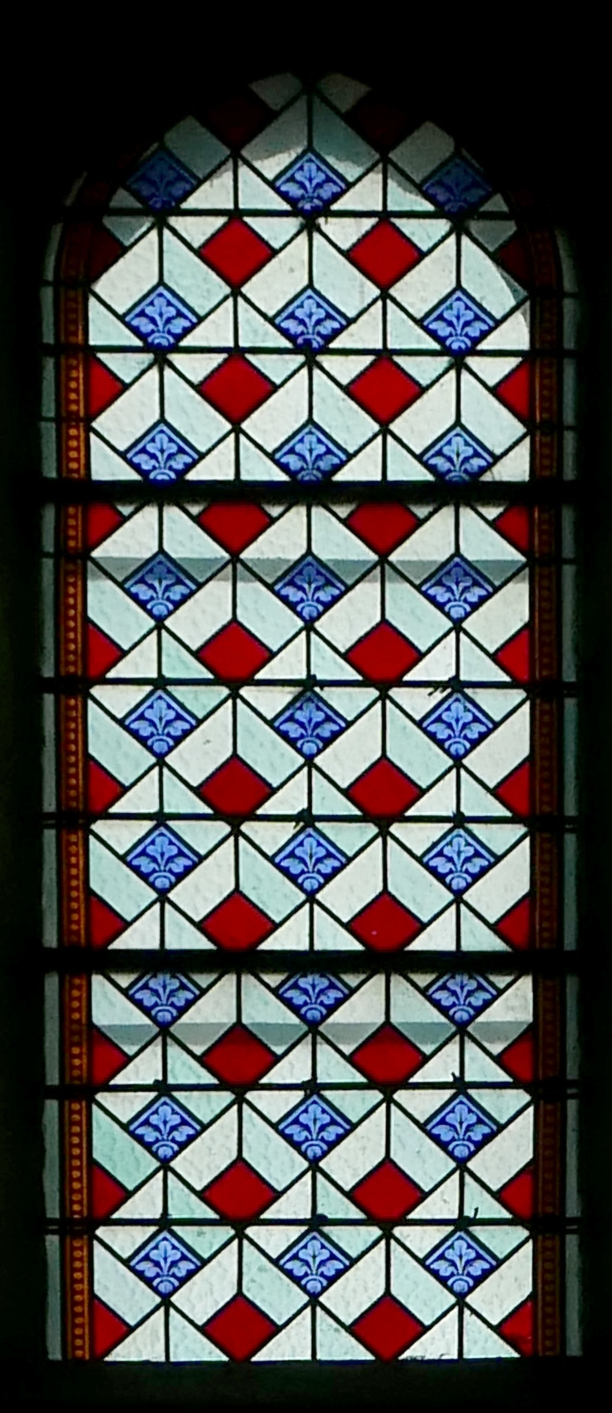 Spitzbogenfenster, das mit einem geometrischen Muster (Raster mit stehenden Vierecken in Rot und Blau) und einem schmalen gelben Rahmen gestaltet ist (identisch mit N IV, N VI, S III und S V).
