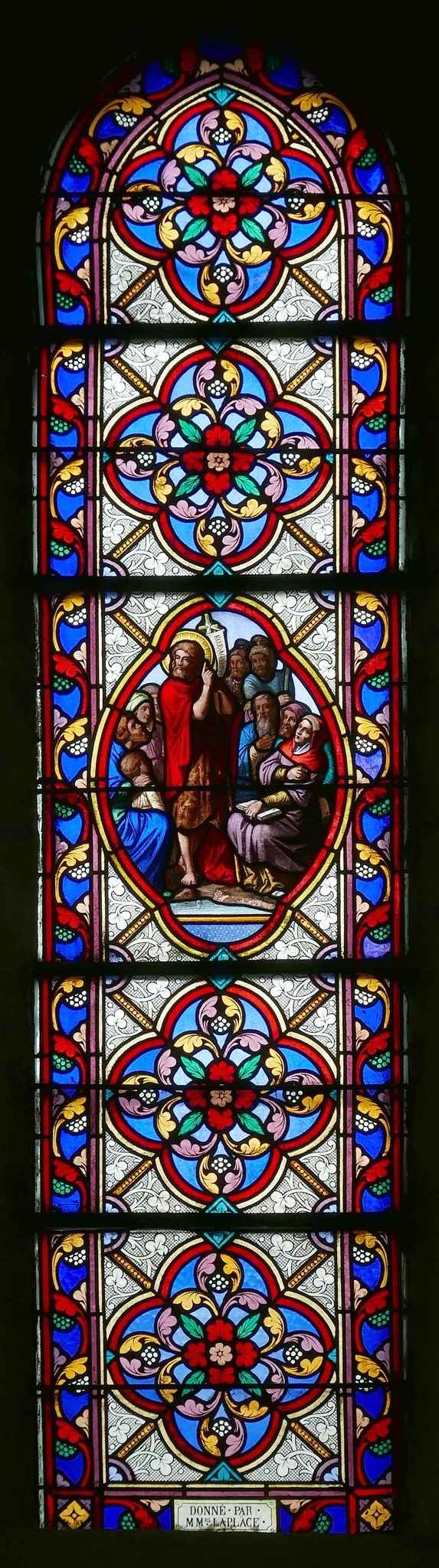 Spitzbogenfenster, das mit einem Bildmedaillon und sich wiederholenden farbigen geometrischen Motiven (stehende Vierpässe und diagonale Linien) sowie mit Grisaillemalerei (Blattranken) und einem farbigen Rahmen mit Blatt- und Blütenmuster im Stil der Gotik gestaltet ist. Im Medaillon ist Johannes der Täufer im Fellgewand und mit einem roten Mantel zu sehen: er predigt am Ufer des Jordans zu einer Menschenmenge und weist mit der Hand auf das Banner mit der Aufschrift «Ecce Agnus Dei», das er an einem Stab mit sich trägt.
