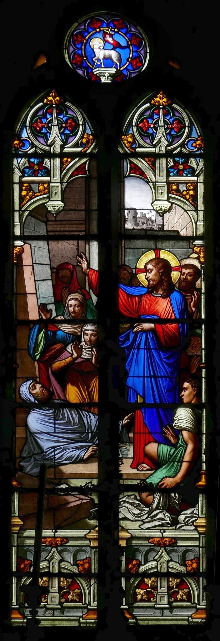 Zweilanzettiges Masswerkfenster mit einer Darstellung der Auferweckung des Lazarus durch Jesus Christus (Joh 11, 1–45). Jesus steht mit einem Jünger am offenen Grab seines Freundes Lazarus und ruft diesen mit erhobener Hand dazu auf, sich aus dem Grab zu erheben. Hinter Lazarus knien seine Schwestern Maria und Martha, weitere anwesende Männer äussern ihr Erstaunen über die Auferstehung. Die Bildszene ist über einem architektonischen Sockel platziert und von schmalen Säulen flankiert, über denen sich ein Baldachin im Stil der Neugotik erhebt. In der kreisrunden Öffnung des Couronnement ist in einem Achtpass mit Blattornamenten das Lamm Gottes mit der Siegesfahne als Symbol für die Auferstehung Jesu Christi gezeigt.
