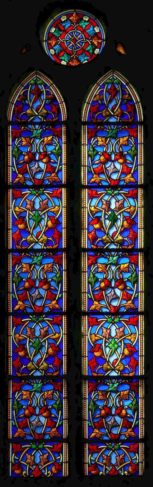 Zweilanzettiges Masswerkfenster mit kreisrundem Couronnement, vollflächig dekoriert mit farbigen Blüten- und Blattranken auf blauem Grund (identisch mit Fenster n II).