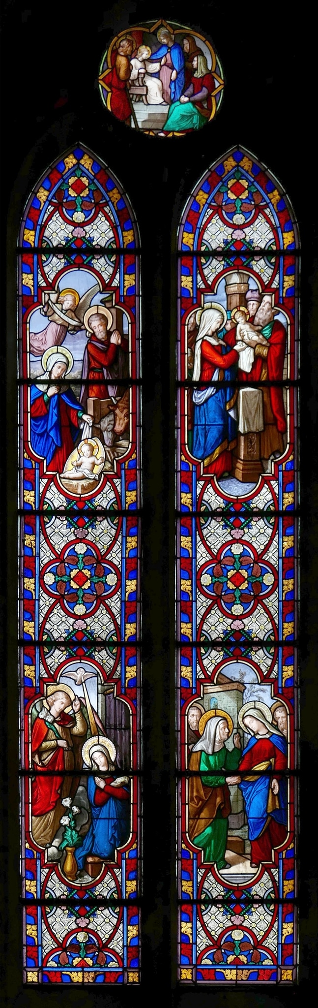 Zweilanzettiges Masswerkfenster mit vier Bildmedaillons auf einem mit farbigen geometrischen Motiven, Grisaillemalerei sowie Blatt- und Blütenornamenten im Stil der Gotik gestalteten Hintergrund. Ein fünftes Bildmedaillon ist in der kreisrunden Öffnung des Couronnement untergebracht. Die Medaillons zeigen von links nach rechts und von unten nach oben die fünf freudenreichen Geheimnisse des Rosenkranzes, welche die Menschwerdung und das Leben Jesu Christi betreffen: (1) Die Verkündigung (Jesus, den du, o Jungfrau, vom Heiligen Geist empfangen hast; Lk 1, 35) zeigt vor einer stilisierten Architektur rechts die betende Jungfrau Maria und links den Engel Gabriel, der ihr von ihrer Schwangerschaft kündet. Neben Maria steht ein Krug mit weissen Lilien, Symbol der Reinheit Marias; über Maria schwebt als Taube der Heilige Geist, dessen Strahlen sich auf Marias Haupt niedersenken. (2) Die Heimsuchung (Jesus, den du, o Jungfrau, zu Elisabeth getragen hast; Lk 1, 39–56) zeigt Maria zu Besuch bei ihrer mit Johannes dem Täufer schwangeren Cousine Elisabeth. Neben den sich begrüssenden Frauen stehen Zacharias und Joseph. (3) Die Geburt Jesu (Jesus, den du, o Jungfrau, zu Bethlehem geboren hast; Lk 2, 1–20) zeigt Maria und Joseph sowie Esel und Ochse neben der Krippe mit dem Jesuskind. Über ihnen schwebt ein Engel mit einem Schriftband. (4) Die Darbringung im Tempel (Jesus, den du, o Jungfrau, im Tempel aufgeopfert hast; Lk 2, 22–24) zeigt Maria, die am Altar das Jesuskind in die Arme von Simeon gibt. Im Hintergrund sind Joseph, die Prophetin Anna und ein Priester dargestellt. (5) Jesus im Tempel (Jesus, den du, o Jungfrau, im Tempel wiedergefunden hast; Lk 2, 41–52) zeigt Maria und Joseph, die den zwölfjährigen Jesus Christus nach längerer Suche im Kreis der Schriftgelehrten im Tempel zu Jerusalem diskutierend wiederfinden.