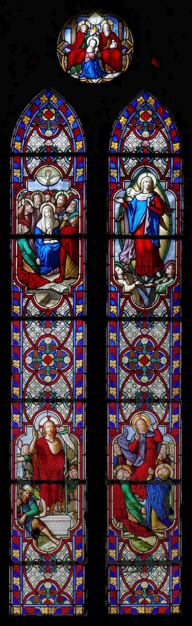 Zweilanzettiges Masswerkfenster mit vier Bildmedaillons auf einem mit farbigen geometrischen Motiven, Grisaillemalerei sowie Blatt- und Blütenornamenten im Stil der Gotik gestalteten Hintergrund. Ein fünftes Bildmedaillon ist in der kreisrunden Öffnung des Couronnement untergebracht. Die Medaillons zeigen von links nach rechts und von unten nach oben die fünf glorreichen Geheimnisse des Rosenkranzes, welche die Auferstehung Jesu Christi betreffen: (1) Die Auferstehung (Jesus, der von den Toten auferstanden ist; Lk 24, 6) zeigt den mit einem roten Tuch bekleideten Jesus Christus, wie er mit dem Kreuzstab in der Hand aus dem Grab steigt. Am Grab sitzen zwei schlafende Soldaten, ein dritter ergreift die Flucht. (2) Die Himmelfahrt (Jesus, der in den Himmel aufgefahren ist; Apg 1, 9–11) zeigt eine Gruppe nach oben blickender Apostel, in deren Mitte Jesus Christus himmelwärts aufsteigt. (3) Das Pfingstwunder (Jesus, der uns den Heiligen Geist gesandt hat; Apg 2, 1–13) zeigt, wie die zwölf Jünger Christi und die Jungfrau Maria an Pfingsten durch den Heiligen Geist erfüllt werden, der sich in Form von Flammen aus einer Taube (dem Heiligen Geist) auf ihre Häupter herabsenkt. (4) Die Aufnahme Marias in den Himmel (Jesus, der dich, o Jungfrau, in den Himmel aufgenommen hat) zeigt die Jungfrau Maria mit erhobenen Händen in einer Mandorla schwebend, wie sie von zwei Engeln in den Himmel emporgehoben wird. (5) Die Krönung Marias (Jesus, der dich, o Jungfrau, im Himmel gekrönt hat) zeigt Jesus (mit Dornenkrone) und Gottvater (mit Reichsapfel), die der knienden Jungfrau Maria eine Krone aufsetzen. Über Maria schwebt als Taube der Heilige Geist.