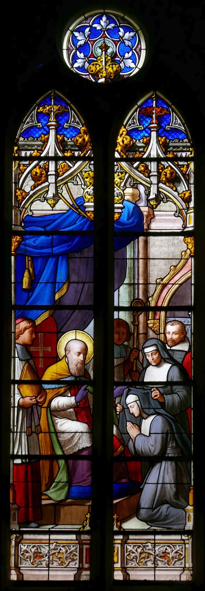 Zweilanzettiges Masswerkfenster mit einer Darstellung des heiligen Franz von Sales (1567–1622), Bischof von Genf, der das Ordensgewand an Jacqueline Favre überreicht, eine der ersten Salesianerinnen. Franz von Sales thront unter einem Baldachin; neben dem Bischof stehen zwei Chordiener, die seine Mitra und seinen Bischofsstab halten. Jacqueline Favre kniet vor dem Prälaten, neben ihr stehen eine ältere Salesianerin und ein Mann, vermutlich ihr Vater, der Rechtsgelehrte Antoine Favre (1557–1624; er ist in der Kapelle, in der sich die Glasmalerei befindet, begraben). Die Bildszene ist über einem architektonischen Sockel platziert und von schmalen Säulen flankiert, über denen sich ein Baldachin im Stil der Neugotik erhebt. Die kreisrunde Öffnung des Couronnement ist mit einem Sechspass mit Blattornamenten und Masswerkschmuck dekoriert.