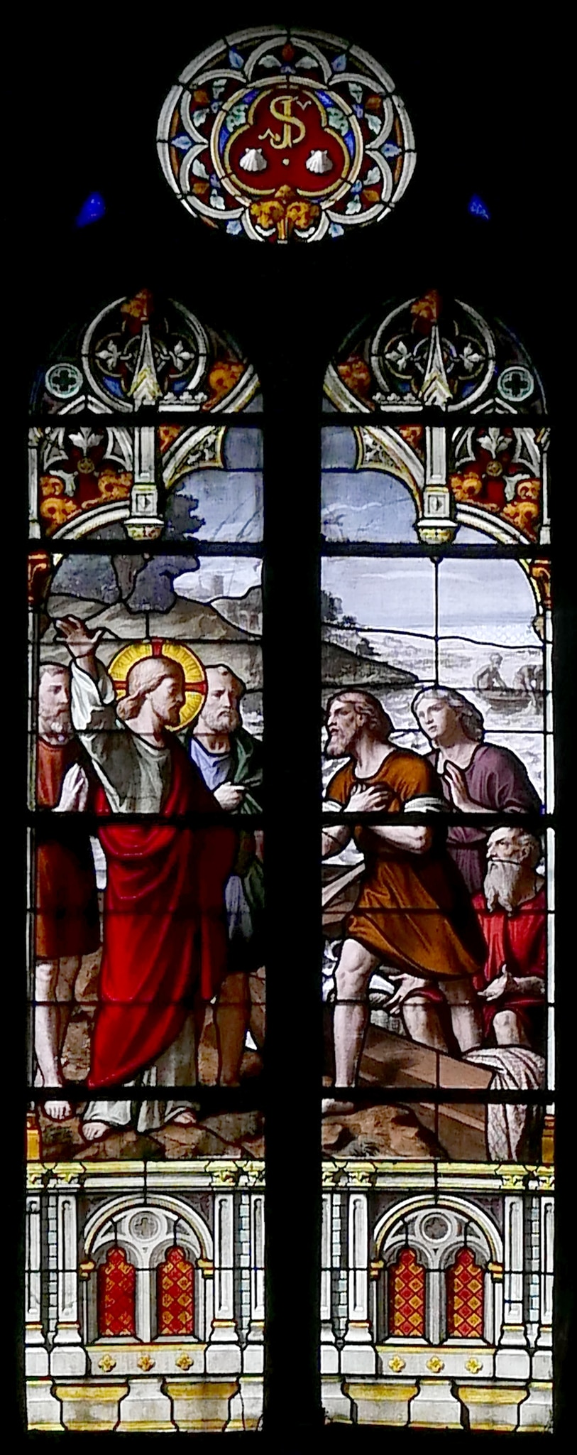 Zweilanzettiges Masswerkfenster mit einer Darstellung der Berufung der ersten Jünger am See Genezareth (Lk 5, 1–11). Nach dem Fischzug des Petrus bringen die Fischer ihre Boote ans Land und lassen alles zurück, um dem auferstandenen Jesus Christus zu folgen. Dieser steht mit erhobenem Arm am Seeufer. Zwei Männer stehen bereits neben ihm (rechts vermutlich Paulus); drei weitere (Petrus, Jakobus, Johannes) steigen aus einem Boot aus und eilen Jesus entgegen. Die Bildszene ist über einem architektonischen Sockel platziert und von schmalen Säulen flankiert, über denen sich ein Baldachin im Stil der Neugotik erhebt. Im kreisrunden Couronnement in einem Sechspass mit Blattornamenten das von zwei Muscheln begleitete Monogramm von Jakobus dem Älteren in einem Dreipass.
