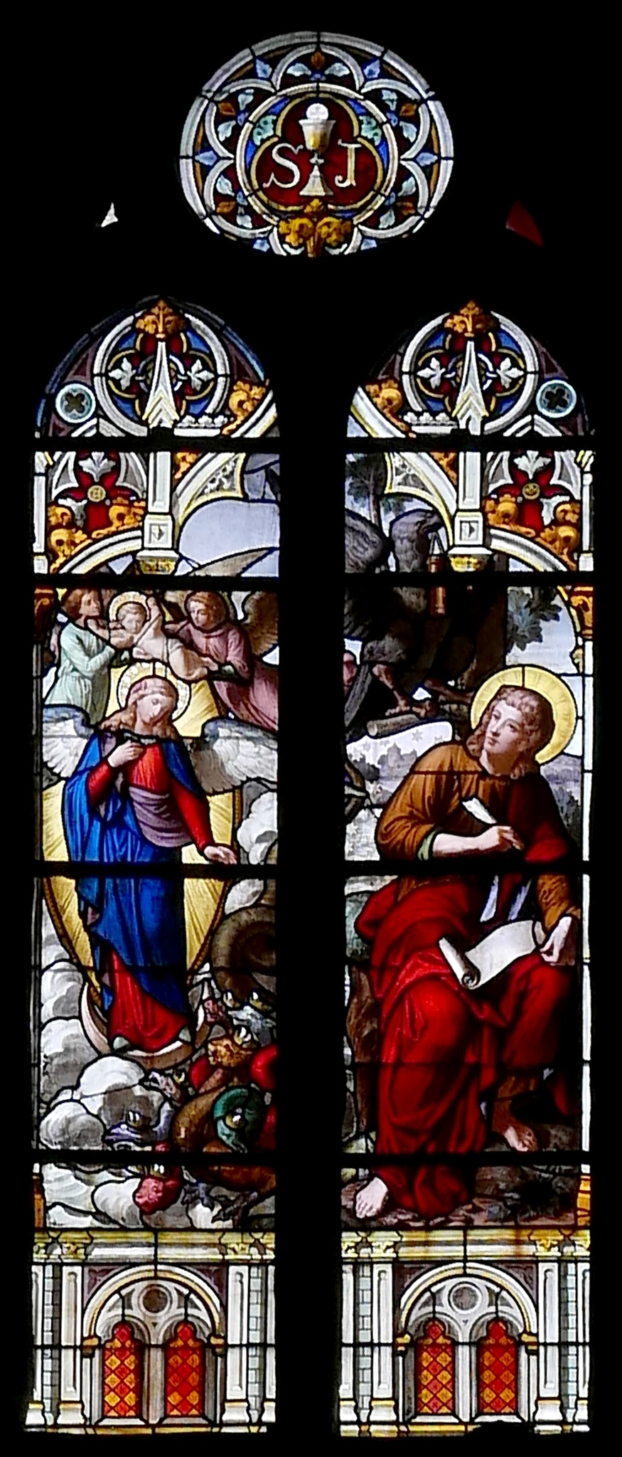 Zweilanzettiges Masswerkfenster mit einer Darstellung des Johannes, der auf Patmos die Visionen der Offenbarung aufschreibt, beschützt von einem Adler. Die Feder in der Hand und eine Schriftrolle auf den Knien blickt Johannes zur apokalyptischen Frau, die ihm als Jungfrau Maria mit Flügeln in einer leuchtenden Mandorla und mit einem Heiligenschein mit zwölf Sternen erscheint (Offb 12, 1–4). Maria steht auf einem Halbmond neben einem Drachen mit sieben Köpfen; darüber tragen zwei Engel das Jesuskind. Die Bildszene ist über einem architektonischen Sockel mit Stifterwappen und Inschrift platziert und von schmalen Säulen flankiert, über denen sich ein Baldachin im Stil der Neugotik erhebt. Im kreisrunden Couronnement in einem Sechspass mit Blattornamenten das Monogramm des Johannes und ein Kelch mit Hostie in einem Dreipass.