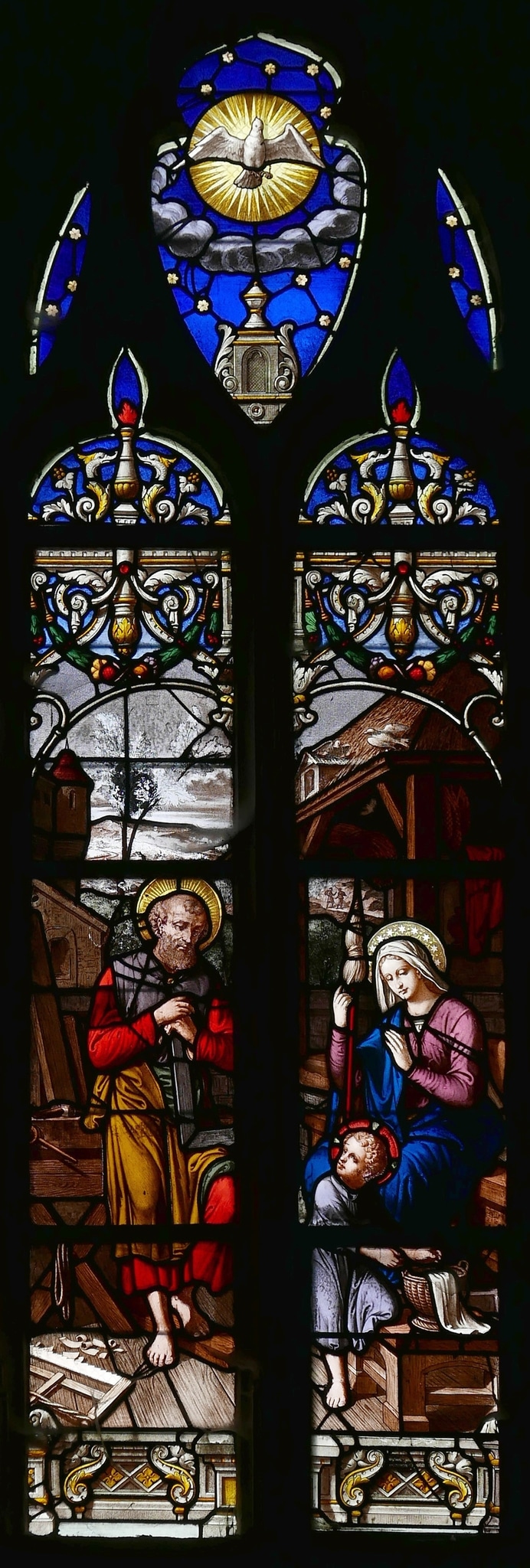 Masswerkfenster mit zwei in Nonnenköpfen endenden Lanzetten und Couronnement. In den beiden Lanzetten ist, über einem architektonischen Sockel und überfasst von girlandenbehängten Baldachinen im Stil der Renaissance die Heilige Familie in Nazareth dargestellt. Das Jesuskind greift nach einem Wäschekorb und dreht sich gleichzeitig nach Joseph um. Dieser lehnt mit einem Winkelmass in den Händen an seiner Werkbank und blickt auf das Kind. Vor ihm am Boden liegen eine Säge und Sägespäne. Hinter Christus sitzt Maria mit einem Spinnrocken in der Hand. Auch sie blickt liebevoll auf das Kind. Im Hintergrund sind ein Gebäude, eine Stadtmauer oder Burg und eine weite Landschaft gezeigt. Im Couronnement schwebt auf blauem, sternenbesetztem Grund der Heilige Geist als Taube, umgeben von einem Strahlen- und einem Wolkenkranz.