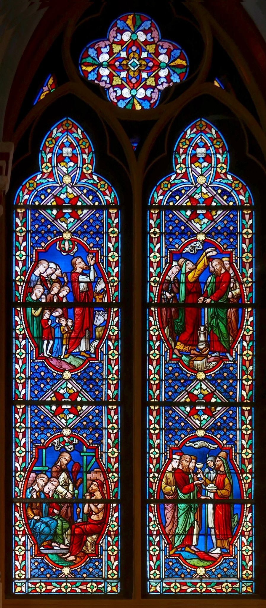 Masswerkfenster mit zwei in Nonnenköpfen endenden Lanzetten; darüber Vierpass als Couronnement. Beide Lanzetten enthalten zwei Medaillons mit Bildszenen, die von unten nach oben gelesen werden. Links unten ist der fromme Hiob gezeigt, der Familie und Besitz verloren hat und nun spärlich bekleidet und betend auf einem Misthaufen sitzt, wo ihn drei Freunde besuchen, um ihn zu trösten (Hiob 2, 11). Darüber ist dargestellt, wie Hiob, der für seine drei in Ungnade gefallenen Freunde bittet, Gnade erfährt und doppelten Besitz und Familie zurückerhält (Hiob 42, 10–11). Das Medaillon rechts unten zeigt wie Abraham nach der Rückeroberung der von den Königen erbeuteten Habe und der Befreiung seines Neffen Lot auf Melchisedek, König von Salem trifft (Gen 14, 18). Der König und Priester empfängt Abraham mit Brot und Wein. Darüber ist zu sehen wie Abraham, der seine Kriegsbeute abgibt, von Melchisedek gesegnet wird (Gen 14, 19).