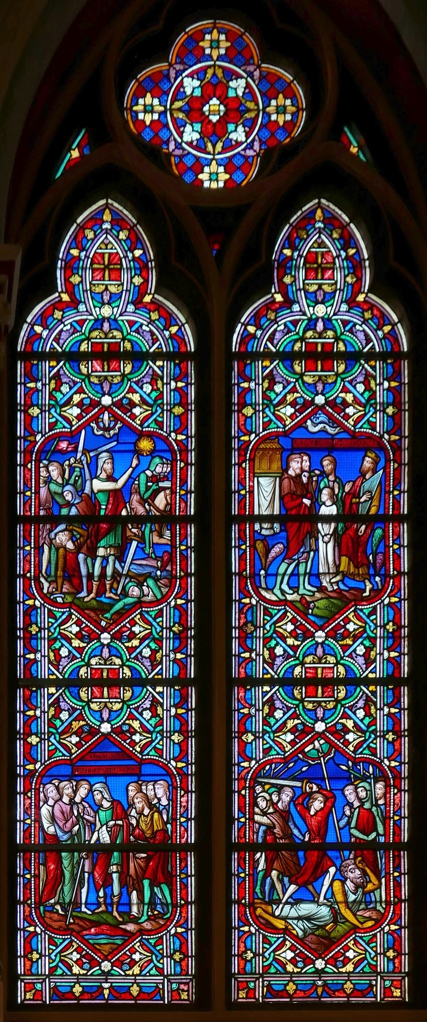 Masswerkfenster mit zwei in Nonnenköpfen endenden Lanzetten; darüber Vierpass als Couronnement. Beide Lanzetten enthalten zwei Medaillons mit Bildszenen, die von unten nach oben gelesen werden. Links unten ist die Aufteilung des Landes Kanaan auf die zwölf israelitischen Stämme gezeigt (Jos 13–19); Josua, der Anführer der Israeliten, hält eine Karte in den Händen und zeichnet mit einem Stock die Grenzen auf den Boden. Darüber ist dargestellt, wie Josua auf dem Schlachtfeld der Sonne befiehlt stillzustehen, bis die Feinde vernichtet sind (Jos 10, 1–15); über ihm ist die Hand Gottes zu sehen. Das Medaillon rechts unten zeigt, wie der Knabe David den Riesen Goliat aus dem Lager der Philister mit dem Schwert tötet (1. Sam 17). Darüber tanzt David, unterdessen König von Israel, mit seiner Harfe vor der Bundeslade, die er nach Jerusalem bringt (2. Sam 6, 1–16).