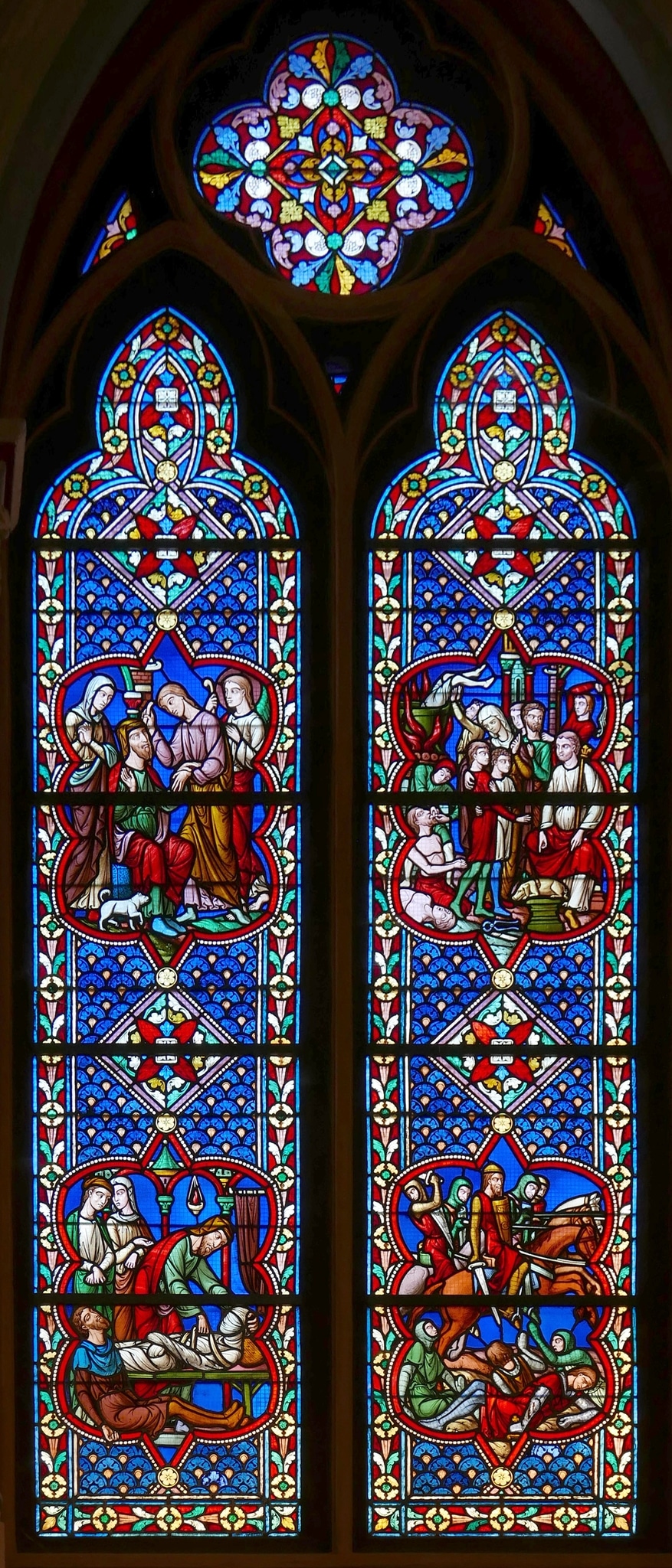 Masswerkfenster mit zwei in Nonnenköpfen endenden Lanzetten; darüber Vierpass als Couronnement. Beide Lanzetten enthalten zwei Medaillons mit Bildszenen, die von unten nach oben gelesen werden. Links unten ist Tobit gezeigt, der in Gefangenschaft der Assyrer heimlich die Leichen verstorbener und getöteter Israeliten zum Begräbnis vorbereitet (Tob 1, 16–18); neben Tobit sind seine Frau Hanna und sein Sohn Tobias gezeigt. Im darüberliegenden Medaillon ist dargestellt wie Tobias, begleitet von einem Engel, nach einer langen Reise zurück zu seinen Eltern kehrt und die Blindheit seines alten Vaters Tobit heilt (Tob 11, 1–14). Das Medaillon rechts unten zeigt Judas Makkabäus, der als berittener Krieger gegen die abtrünnigen Juden kämpft (1. Makk 3, 1–9). Darüber ist das Martyrium der sieben Brüder und ihrer Mutter gezeigt, die sich weigerten, Schweinefleisch zu essen (2. Makk 7); König Antiochus zeigt auf ein kleines Schwein zu seinen Füssen und führt die Brüder in Versuchung, davon zu kosten. Die frommen Söhne bleiben standhaft und werden einer nach dem anderen gefoltert und hingerichtet.