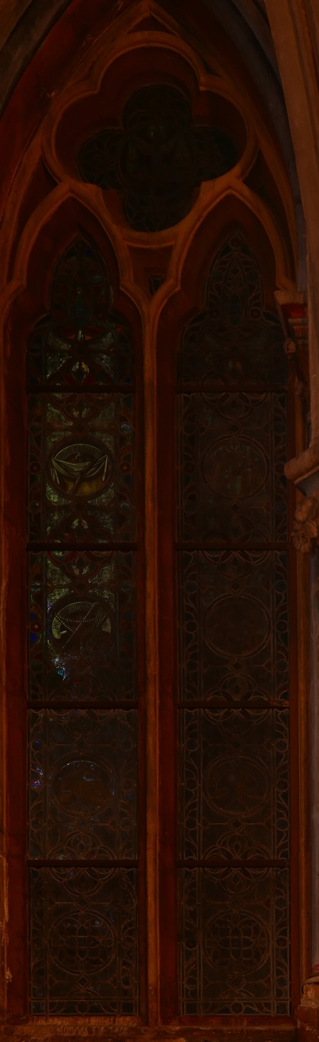 Masswerkfenster mit zwei in Nonnenköpfen endenden Lanzetten; darüber Vierpass als Couronnement. Die Lanzetten enthalten je ein rundes Medaillon mit Blütenfüllung und drei runde Medaillons mit Symbolen und begleitenden Inschriften, die die Sakramente der katholischen Kirche darstellen. Von links nach rechts und von unten nach oben sind gezeigt: die Taufe (Taufbecken), die Eucharistie (Ziborium), die Busse (Rosenkranz), die Firmung (Bischofskreuz und Ölgefäss), die Ehe (Ring, Schleier, gebrochener Stab) und die Krankensalbung (Ölgefäss). Im Couronnement ist das siebte Sakrament, die Weihe (Stola, segnende Hand) dargestellt.