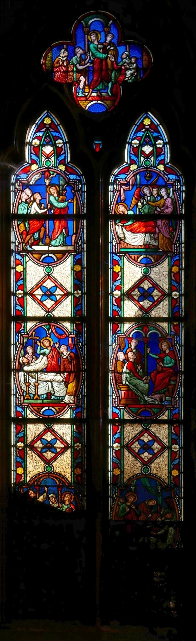 Eine von 62 Glasmalereien der ab 1860 neu errichteten, monumentalen neugotischen Kirche Saint-Bruno in Voiron. Die um 1870 fertiggestellte Glasmalerei-Ausstattung wurde durch eine grosszügige Spende des Kartäuserordens, dessen Mutterkloster «La Grande Chartreuse» sich ca. 25 km östlich von Voiron befindet, finanziert (Avenir, 2006, S. 103). Für den Bau der Kirche hatte sich Frédéric Faige-Blanc (1811–1902), Bürgermeister von Voiron ab 1851, stark eingesetzt. Faige-Blanc war es auch, der den Kontakt zum Atelier Gsell-Laurent in Paris herstellte, das die Glasmalereien der Kirche Saint-Bruno ab 1869 für insgesamt 71’000 Francs herstellte (Gautier, 2010, S. 62, 72). Es handelt sich um einen der umfangreichsten Aufträge, die das damals bereits etablierte Atelier ausführte.