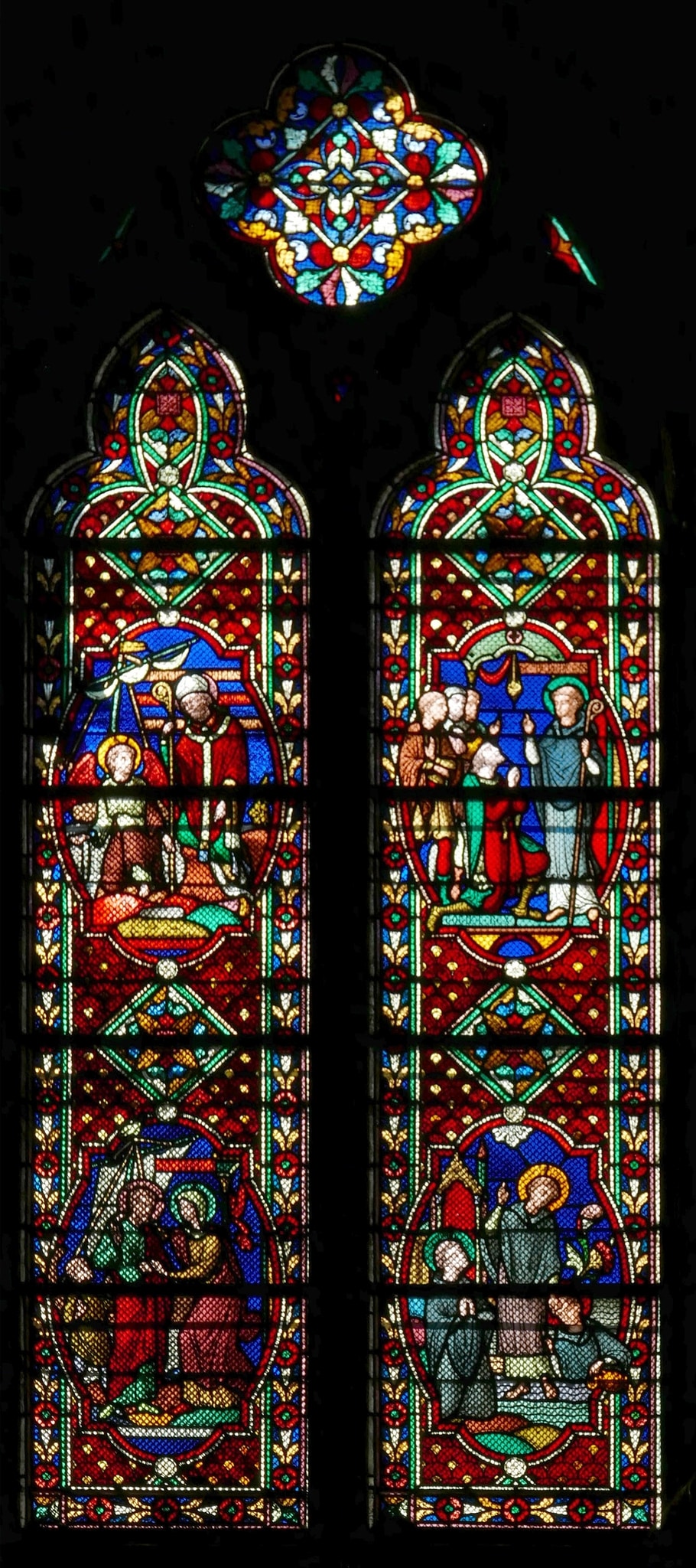 Masswerkfenster mit zwei in Nonnenköpfen endenden Lanzetten; darüber Vierpass als Couronnement. Beide Lanzetten enthalten zwei Medaillons mit Bildszenen, die von unten nach oben gelesen werden. Links unten ist die Abreise des Augustinus von Hippo (354–430) gezeigt; vor dem Schiff, das ihn nach Italien bringen wird, verabschiedet sich der Heilige von seiner Mutter, der heiligen Monika von Tagaste. Darüber ist dargestellt, wie Augustinus sich mit der Trinitätslehre beschäftigt und dabei laut einer Legende auf einen Knaben oder Engel trifft, der Meerwasser in ein Loch schöpft und feststellt, er habe eher das ganze Meerwasser in dieses Loch geschöpft, als dass Augustinus das Mysterium der Dreifaltigkeit verstehen werde. Das Medaillon rechts unten zeigt Benedikt von Nursia (480–547), der seinem Schüler Maurus befiehlt über das Meer zu gehen, um den ins Wasser gefallenen Mitbruder Placidus zu retten; die Szene steht für die Gehorsamkeit seiner Anhänger. Darüber kniet Totila, König der Ostgoten, vor dem heiligen Benedikt; dieser prophezeit ihm seinen Einzug in Rom und fordert ihn zu weniger Grausamkeit auf.