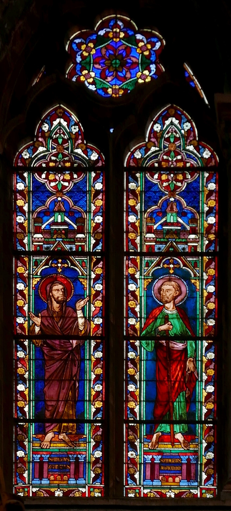 Masswerkfenster mit zwei in Nonnenköpfen endenden Lanzetten; darüber Sechspass als Couronnement. Das Obergadenfenster zeigt zwei Vorfahren von Jesus Christus auf blauem Grund: Zacharias, den Vater Johannes des Täufers in der linken Lanzette; Joachim, den Vater Marias in der rechten Lanzette. Die Figuren stehen auf einem architektonischen Sockel mit jeweiligem Namenszug und sind von schmalen Säulen flankiert, über denen sich Baldachine im Stil der Gotik und je ein Vierpass erheben. Die Lanzetten haben farbige ornamentale Rahmen. Im Couronnement konzentrisch angeordnete Blüten- und Blattornamente; zudem mehrere Masswerkspickel mit farbigen Füllungen.