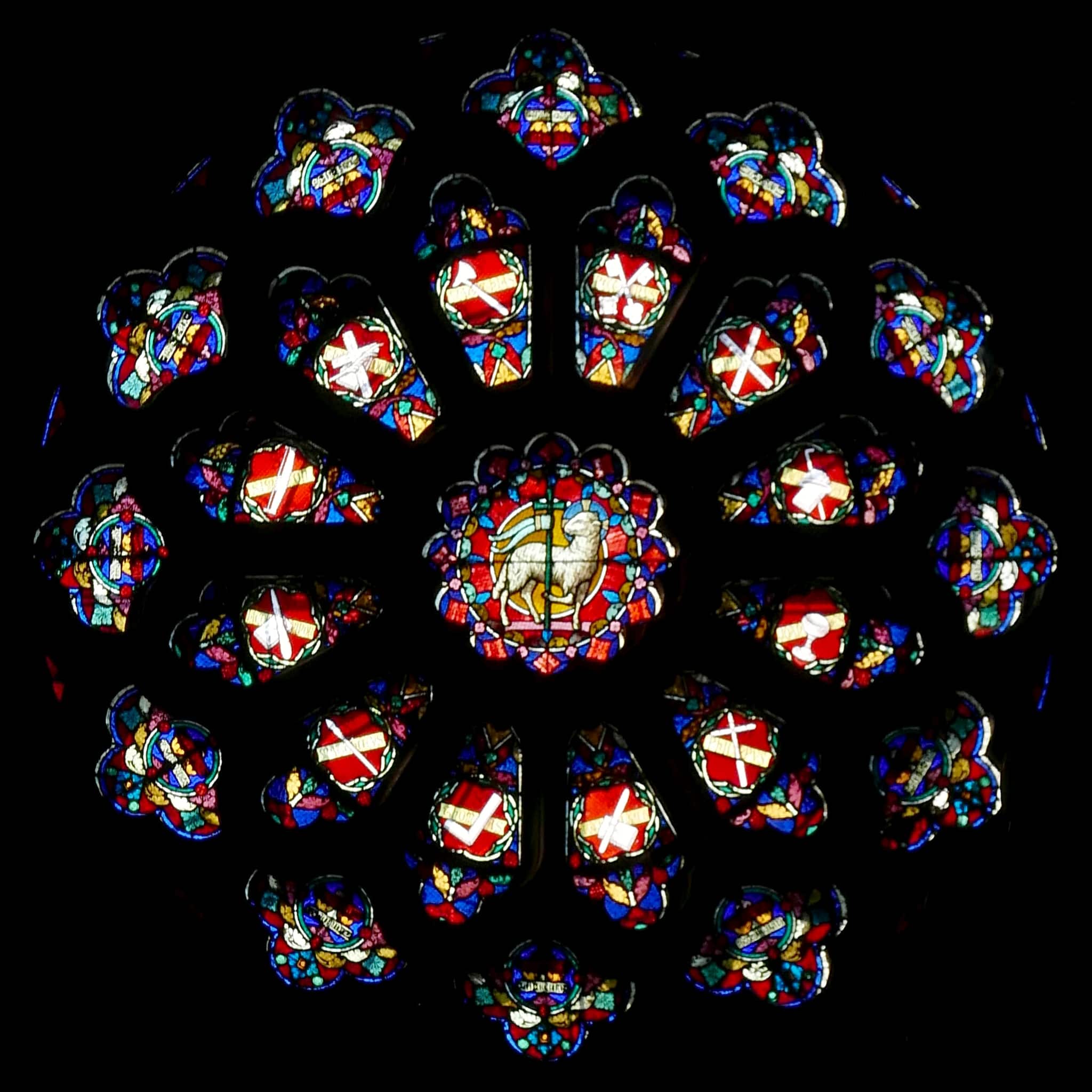 Rosenfenster mit drei kreisförmig angeordneten Registern. Das Zentrum bildet ein Zwölfpass mit dem Siegeslamm, Symbol der Auferstehung Jesu Christi. Rundherum sind zwischen den Radspeichen des Fensters zwölf Lanzetten mit Nonnenköpfen angeordnet, die mit Blattornamenten und runden Medaillons dekoriert sind. Die Medaillons zeigen auf rotem Grund die Attribute und Namen der zwölf Apostel (von oben im Uhrzeigersinn): Zwei Schlüssel für Petrus, ein Kreuz für Andreas, Pilgerstab, Pilgerhut und Buch für Jakobus den Älteren, einen Kelch für Johannes, einen Kreuzstab für Philippus, Messer und Buch für Bartholomäus, ein Winkelmass für Thomas, eine Lanze für Matthäus, Keule und Buch für Jakobus den Jüngeren, eine Säge für Simon, Kreuz, Buch und Märtyrerpalme für Thaddäus, und ein Beil für Matthias. Das äussere Register ist mit zwölf Vierpässen mit Blattdekor und in einen Kreis eingeschriebenen Schriftbändern mit Ausschnitten aus dem Apostolischen Glaubensbekenntnis «Credo» besetzt.