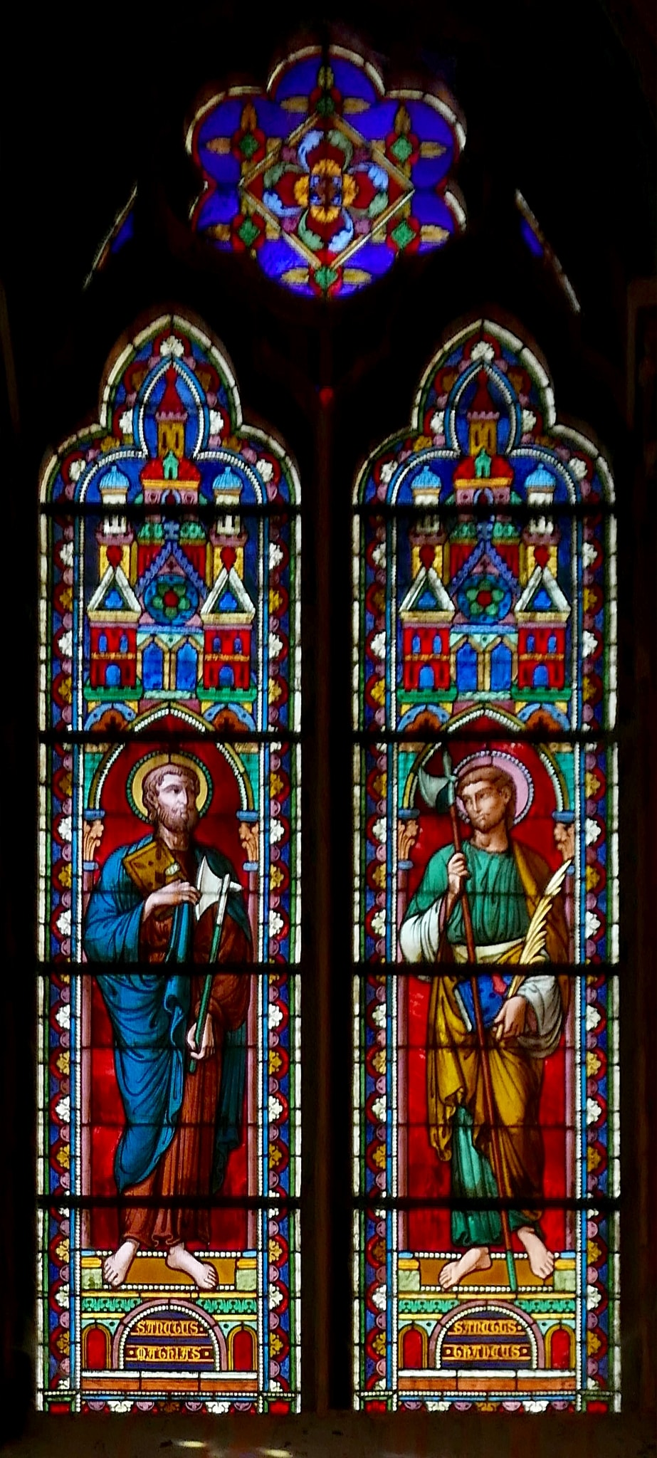 Masswerkfenster mit zwei in Nonnenköpfen endenden Lanzetten; darüber Sechspass als Couronnement. Das Obergadenfenster zeigt zwei Apostel auf rotem Grund: Matthias mit einem Beil und einem Buch; Thaddäus mit Hellebarde, Buch und Märtyrerpalme. Die Figuren stehen auf einem architektonischen Sockel mit jeweiligem Namenszug und sind von schmalen Säulen flankiert, über denen sich Baldachine im Stil der Gotik erheben. Die Lanzetten haben farbige ornamentale Rahmen. Im Couronnement konzentrisch angeordnete Blüten- und Blattornamente sowie ein eingeschriebenes stehendes Quadrat (Grundfarbe Blau); zudem mehrere Masswerkspickel mit farbigen Füllungen.