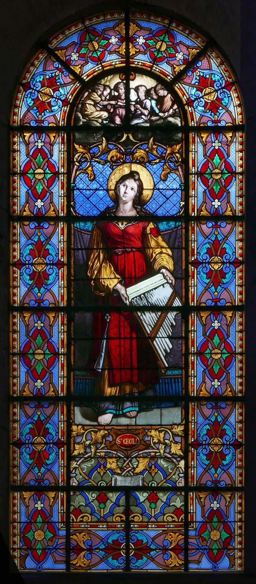 Das Cäcilia-Fenster ist eine von 14 Glasmalereien mit Heiligenfiguren aus dem Pariser Glasmalerei-Atelier Laurent, Gsell et Cie. (später Gsell-Laurent), die 1863 in Chor und Schiff der Kirche Notre-Dame de l’Assomption in Saint-Dizier eingesetzt wurden. Damals engagierte sich der Pfarrer Pierre Marie Didelot (1803–1873) stark für die Ausstattung der Kirche. Bürger und Bürgerinnen sowie verschiedene Vereinigungen und Zünfte von Saint-Dizier stifteten die Glasmalereien. Sie zeigen Vorbilder des christlichen Lebens und Schutzpatrone und weisen mehrere Bezüge zur örtlichen Eisenindustrie auf. Im Chor und auf der Nordseite des Schiffs sind männliche Heilige gezeigt, auf der Südseite des Schiffs weibliche Heilige. Die sechs Fenster im westlichen Teil des Schiffs sind kleiner als die vier Fenster im östlichen Teil des Schiffs und im Chor. Alle Fenster sind nach dem gleichen Prinzip gestaltet, lassen sich aber aufgrund unterschiedlicher Ornamentrahmen in drei Gruppen gliedern. Insgesamt kosteten die Glasmalereien 15’000 Francs. Die Glasmalerei der heiligen Cäcilia von Rom, Schutzpatronin der Kirchenmusik, stifteten die Musikvereinigungen von Saint-Dizier (Didier, 1897, S. 179). Als Vorlage für die Darstellung der Cäcilia wurde ein Altarbild Raffaels, Die Verzückung der Heiligen Cäcilia, aus dem 16. Jahrhundert herangezogen. Aus diesem Grund wurde auch das Bogenfeld der Glasmalerei anders gestaltet als in den übrigen Glasmalereien der Kirche. Im Cäcilia-Fenster findet sich zudem ein aus der ibero-islamischen Baukunst abgeleitetes sogenanntes «Sebka»-Ornament mit Rautenelementen aus sich überschneidenden Bögen. Dieses Ornament wurde durch Publikationen wie Jules Goury und Owen Jones’s Plans, Elevations, Sections and Details of the Alhambra (London 1842 und 1845) in der Kunst und Architektur des 19. Jahrhunderts populär.