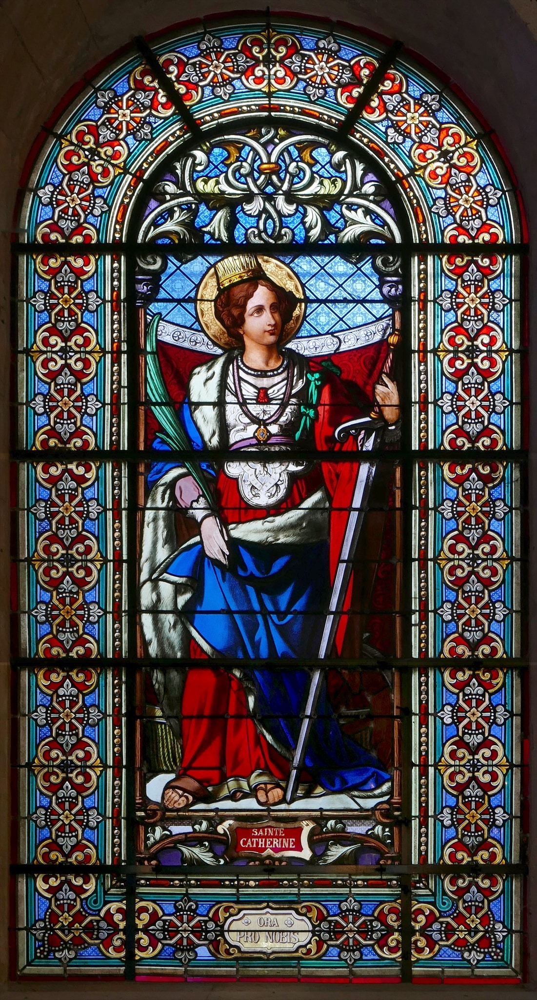 Das Katharina-Fenster ist eine von 14 Glasmalereien mit Heiligenfiguren aus dem Pariser Glasmalerei-Atelier Laurent, Gsell et Cie. (später Gsell-Laurent), die 1863 in Chor und Schiff der Kirche Notre-Dame de l’Assomption in Saint-Dizier eingesetzt wurden. Damals engagierte sich der Pfarrer Pierre Marie Didelot (1803–1873) stark für die Ausstattung der Kirche. Bürger und Bürgerinnen sowie verschiedene Vereinigungen und Zünfte von Saint-Dizier stifteten die Glasmalereien. Sie zeigen Vorbilder des christlichen Lebens und Schutzpatrone und weisen mehrere Bezüge zur örtlichen Eisenindustrie auf. Im Chor und auf der Nordseite des Schiffs sind männliche Heilige gezeigt, auf der Südseite des Schiffs weibliche Heilige. Die sechs Fenster im westlichen Teil des Schiffs sind kleiner als die vier Fenster im östlichen Teil des Schiffs und im Chor. Alle Fenster sind nach dem gleichen Prinzip gestaltet, lassen sich aber aufgrund unterschiedlicher Ornamentrahmen in drei Gruppen gliedern. Insgesamt kosteten die Glasmalereien 15’000 Francs. Die Glasmalerei der heiligen Katharina von Alexandrien stifteten Mädchen von Saint-Dizier (Didier, 1897, S. 179). Im Musée Carnavalet in Paris wird eine Entwurfszeichnung dazu aufbewahrt (D.16044).