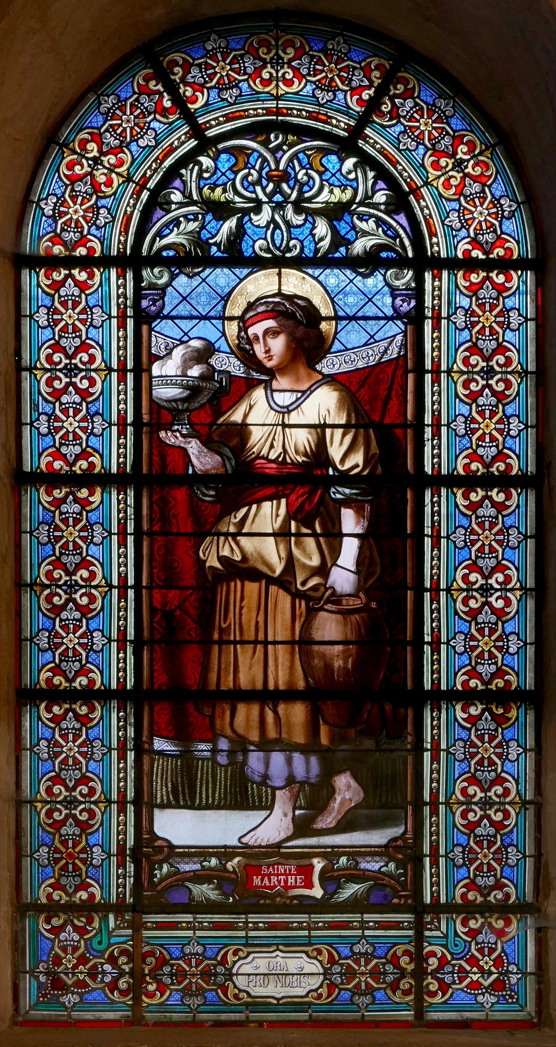 Das Martha-Fenster ist eine von 14 Glasmalereien mit Heiligenfiguren aus dem Pariser Glasmalerei-Atelier Laurent, Gsell et Cie. (später Gsell-Laurent), die 1863 in Chor und Schiff der Kirche Notre-Dame de l’Assomption in Saint-Dizier eingesetzt wurden. Damals engagierte sich der Pfarrer Pierre Marie Didelot (1803–1873) stark für die Ausstattung der Kirche. Bürger und Bürgerinnen sowie verschiedene Vereinigungen und Zünfte von Saint-Dizier stifteten die Glasmalereien. Sie zeigen Vorbilder des christlichen Lebens und Schutzpatrone und weisen mehrere Bezüge zur örtlichen Eisenindustrie auf. Im Chor und auf der Nordseite des Schiffs sind männliche Heilige gezeigt, auf der Südseite des Schiffs weibliche Heilige. Die sechs Fenster im westlichen Teil des Schiffs sind kleiner als die vier Fenster im östlichen Teil des Schiffs und im Chor. Alle Fenster sind nach dem gleichen Prinzip gestaltet, lassen sich aber aufgrund unterschiedlicher Ornamentrahmen in drei Gruppen gliedern. Insgesamt kosteten die Glasmalereien 15’000 Francs. Die Glasmalerei der heiligen Martha von Bethanien, Schutzpatronin der Hausangestellten, stifteten bedienstete Frauen von Saint-Dizier (Didier, 1897, S. 179). Im Musée Carnavalet in Paris wird eine Entwurfszeichnung dazu aufbewahrt (D.16044).