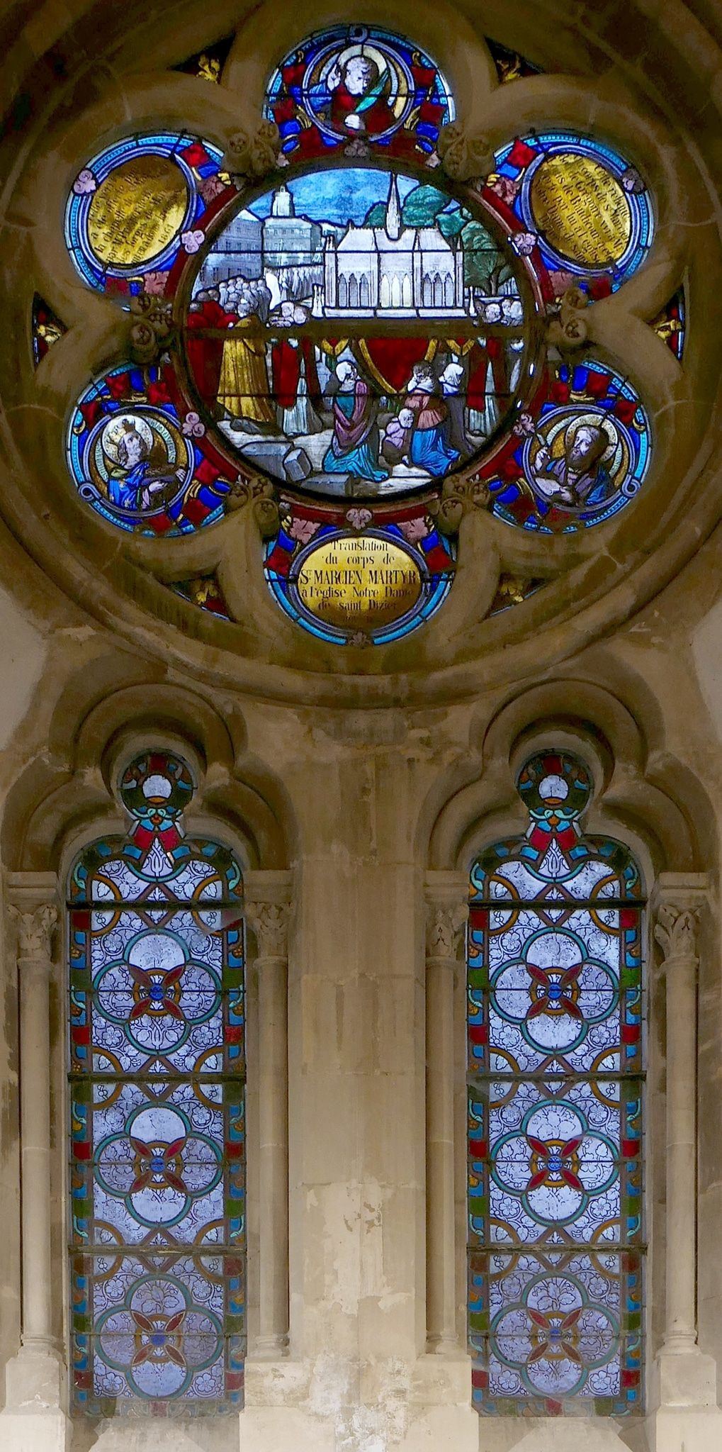 In dickes Mauerwerk eingelassenes Masswerkfenster mit zwei Lanzetten und Couronnement mit einbeschriebenem Sechspass. Die Lanzetten sind mit einem Ornament im Stil der Gotik mit sich wiederholenden farbigen Kreis- und Vierpassformen und Grisaille-Dekor ausgefüllt. Farbiger Rahmen in Blau, Grün und Rot mit stilisierten gelben Knospen. Darüber ist im Zentrum des Sechspasses die Translatio der Reliquien des heiligen Marcianus von Syrakus gezeigt. Sein Reliquienschrein wird in einer Prozession zur Kirche von Saint-Dizier getragen, Gläubige knien vor dem Schrein nieder. In den Pässen sind – umfasst von farbigen Blattranken – drei Schriftkartuschen und drei Medaillons mit Brustbildern von Heiligen untergebracht: oben ein Märtyrer (Marcianus von Syrakus?) mit Märtyrerpalme, links Ludwig IX. (Saint Louis) mit der Dornenkrone, rechts Prosper Tiro von Aquitanien (Saint Prosper) mit Buch und Feder, der Namenspatron des Stifters.