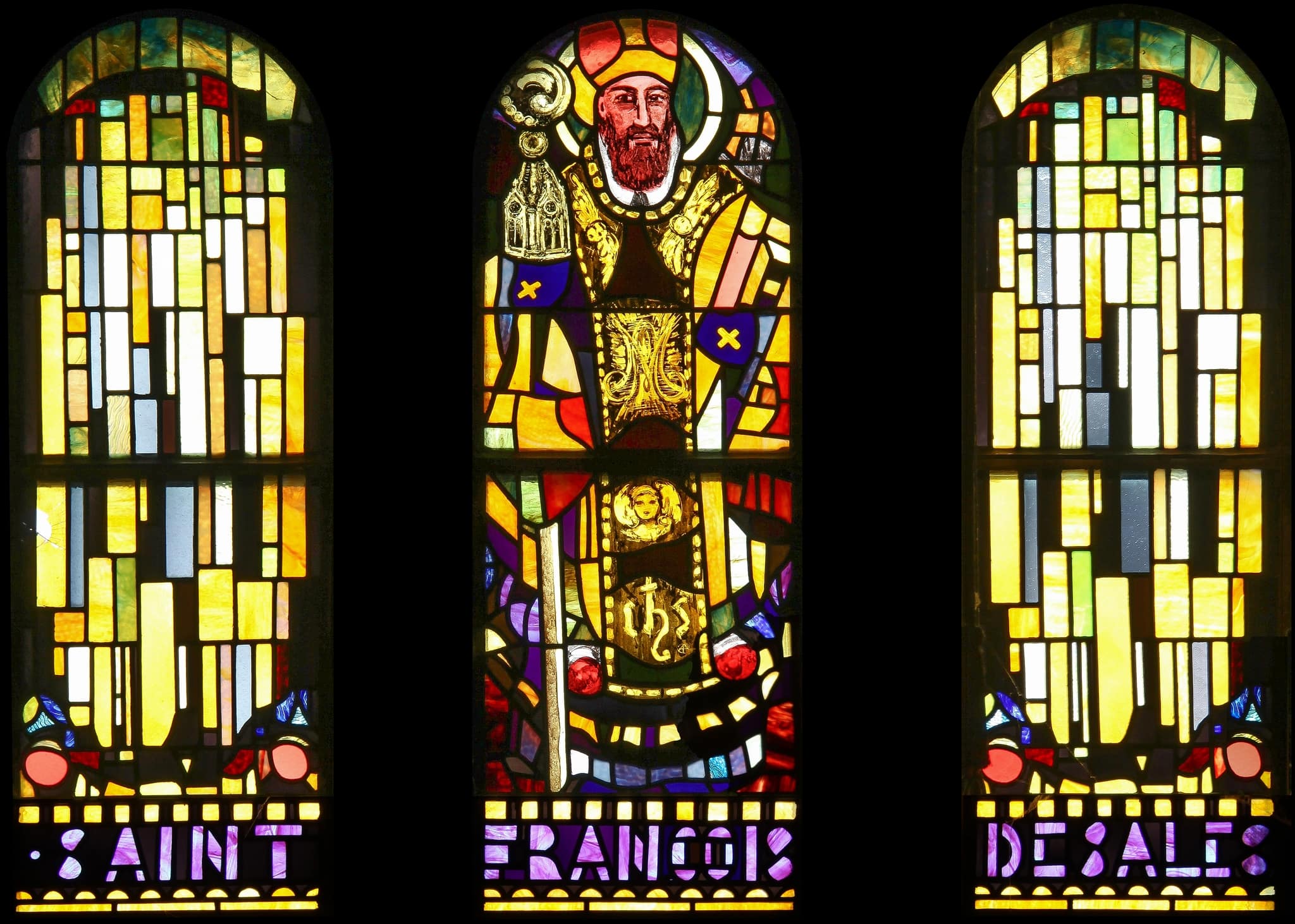 Vitrail composé de trois baies avec saint François de Sales au centre. Il est figuré debout, de face, auréolé et coiffé de la mitre d’évêque. Il porte une barbe brune et tient de ses mains gantées une crosse de la droite et un livre de la gauche. Il est vêtu d’une chasuble ornée de trois têtes d’anges ailés et des monogrammes de la Vierge “AM” et du Christ “IHS”.