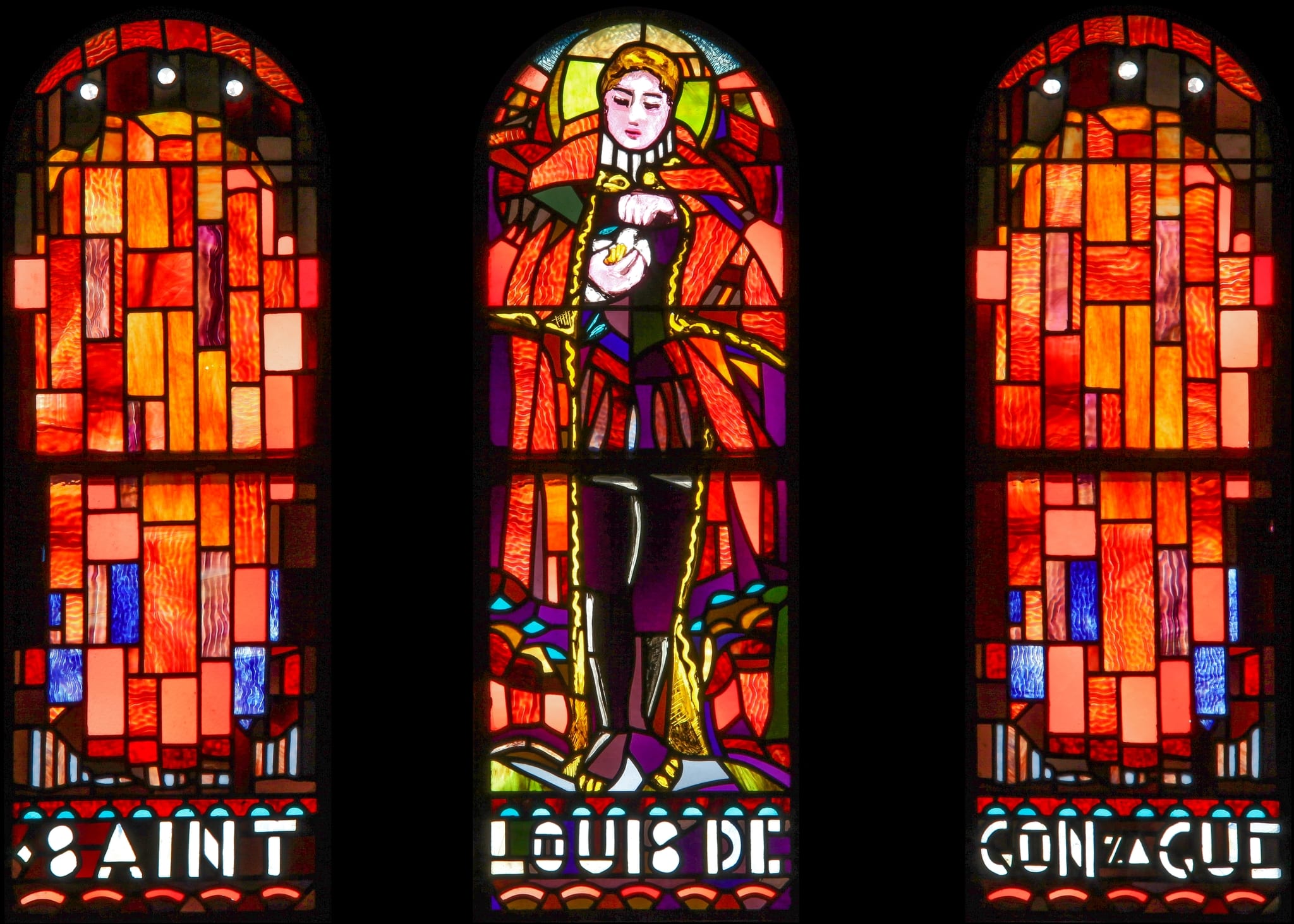 Vitrail composé de trois baies avec saint Louis de Gonzague au centre. Saint Louis de Gonzague est figuré debout, de face et auréolé, sa tête légèrement tournée vers la gauche. Représenté très jeune (peut-être alors qu’il était page à la cour de Philippe II d’Espagne), il porte une collerette autour de son cou et un haut-de-chausses couvrant ses jambes jusqu’au dessus de ses genoux. Ses épaules sont couvertes d’un long manteau rouge liseré d’or et il tient quelque chose dans sa main droite.