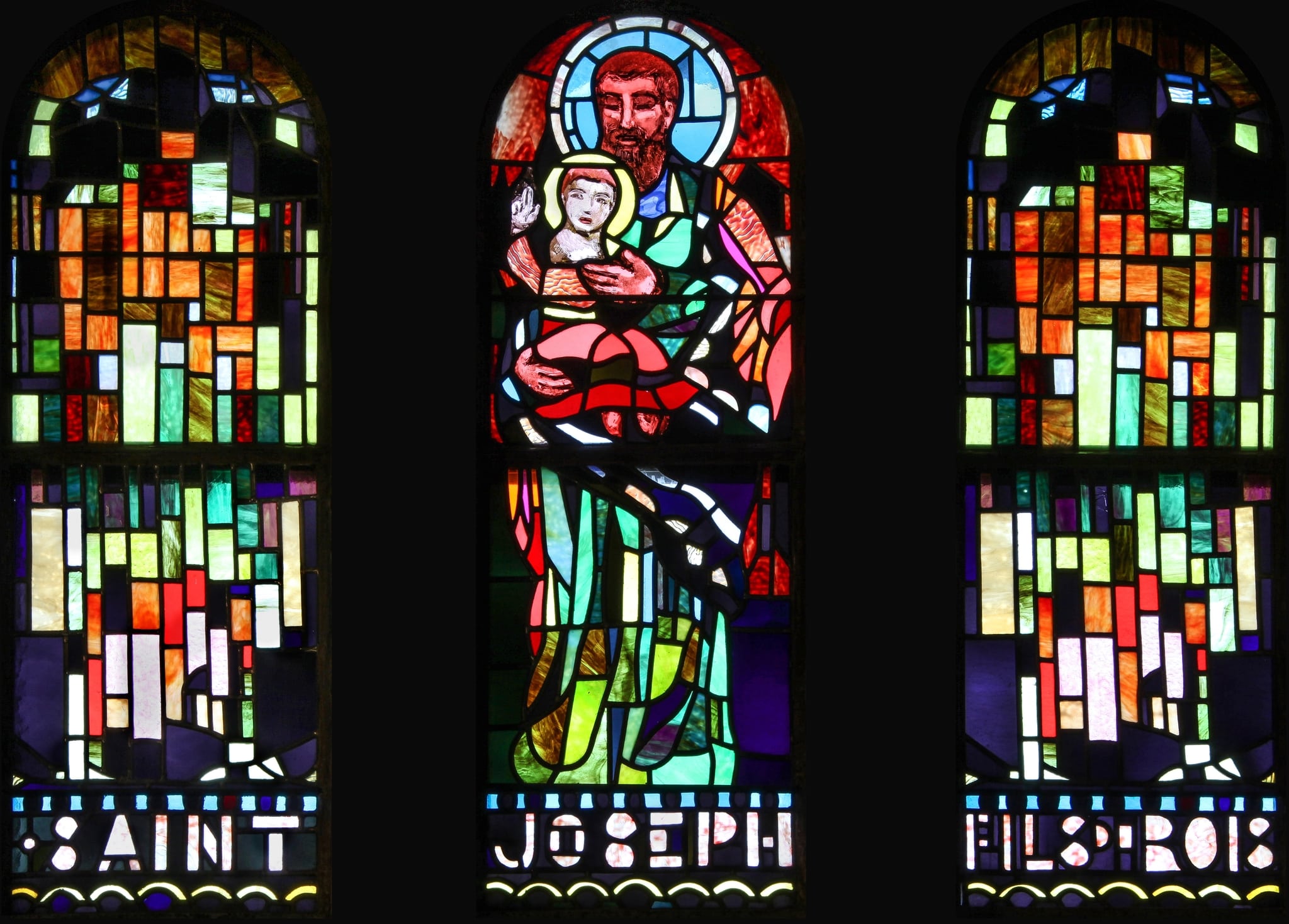 Vitrail composé de trois baies avec saint Joseph au centre. Il est figuré debout, de face et auréolé. Il porte dans ses bras l’enfant Jésus, également nimbé. Celui-ci lève sa main droite en signe de bénédiction. Joseph, qui baisse les yeux pour regarder Jésus, porte une grande barbe rousse et est vêtu d’une longue tunique surmontée d’un manteau.