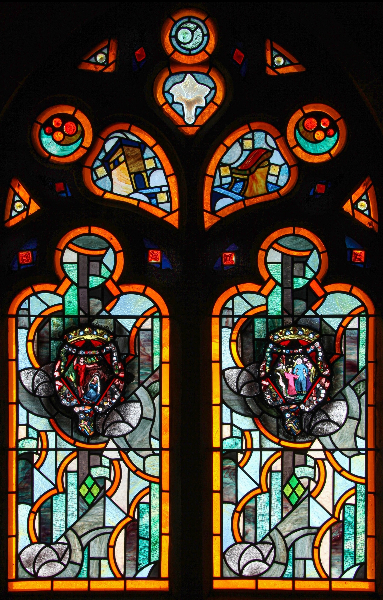 Vitrail à deux lancettes avec au centre de chacune d’elle une scène de la vie de la Vierge inscrite dans un losange : à gauche, l’Assomption et, à droite, la Visitation.