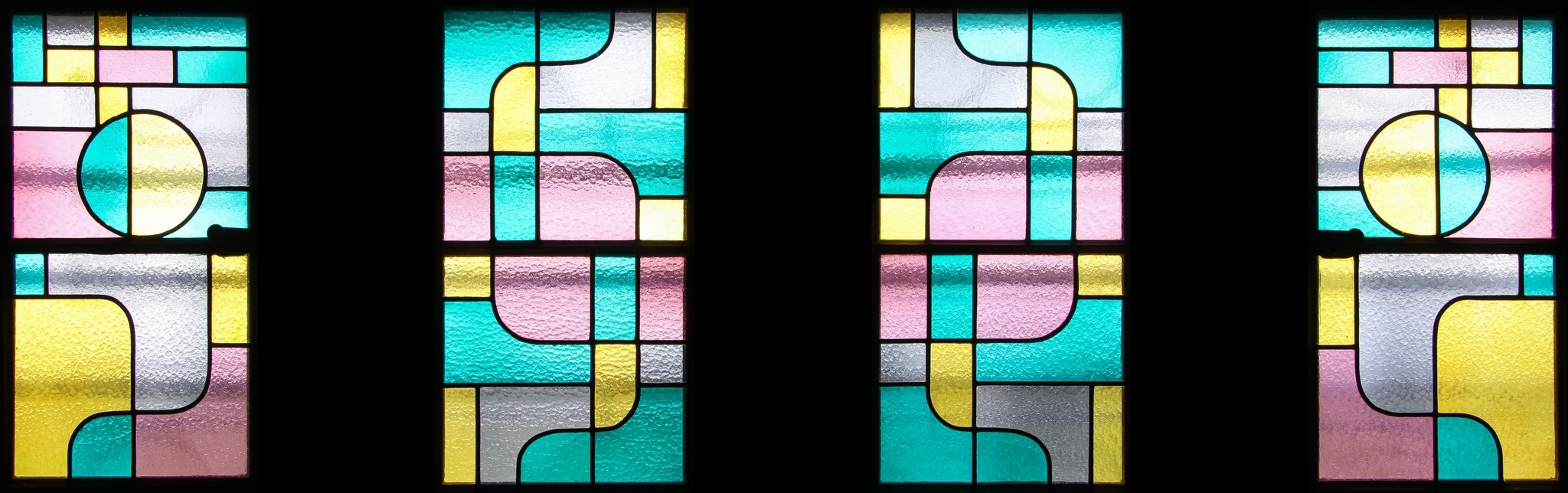 Quatre petites fenêtres disposées côte à côte se composent de grands motifs géométriques bleus, jaunes, roses et gris. Elles sont toutes les quatre agencées en miroir, les deux du centre présentant des motifs différents des deux verrières extérieures, qui comportent un grand cercle dans leur partie supérieure.