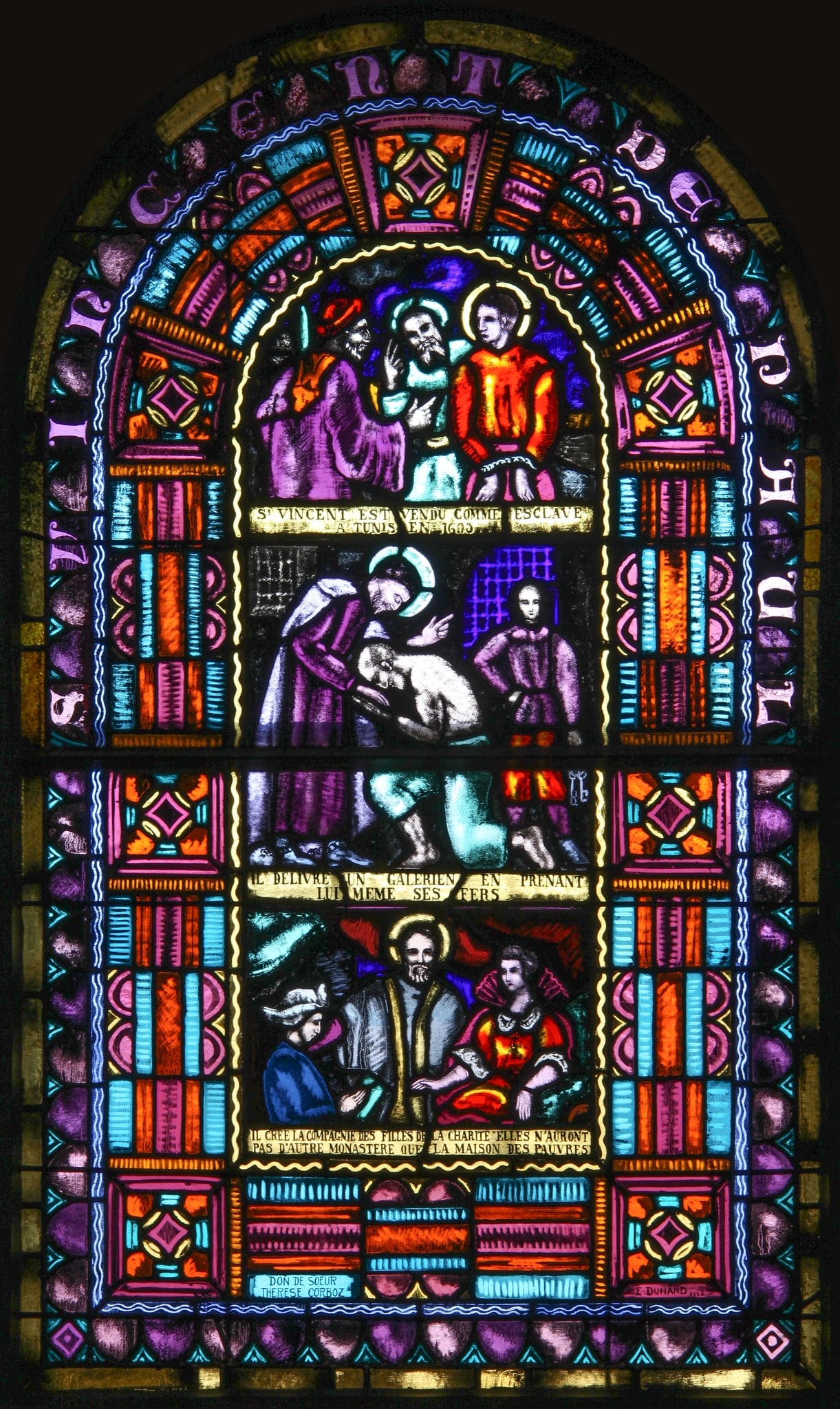 Cette verrière est composée de trois scènes superposées relatant différents épisodes de la vie de saint Vincent de Paul, encadrées d’une très large bordure géométrique.