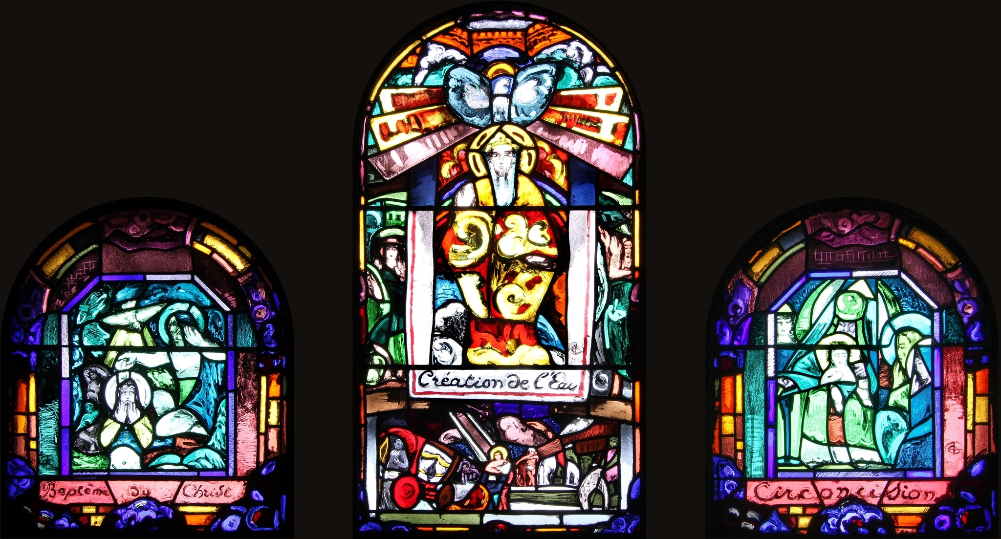 Ce vitrail est composé de trois fenêtres relatant deux épisodes de la vie du Christ relatifs à des rites de passage dans la communauté chrétienne (baptême et circoncision) et la création de l’eau.