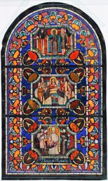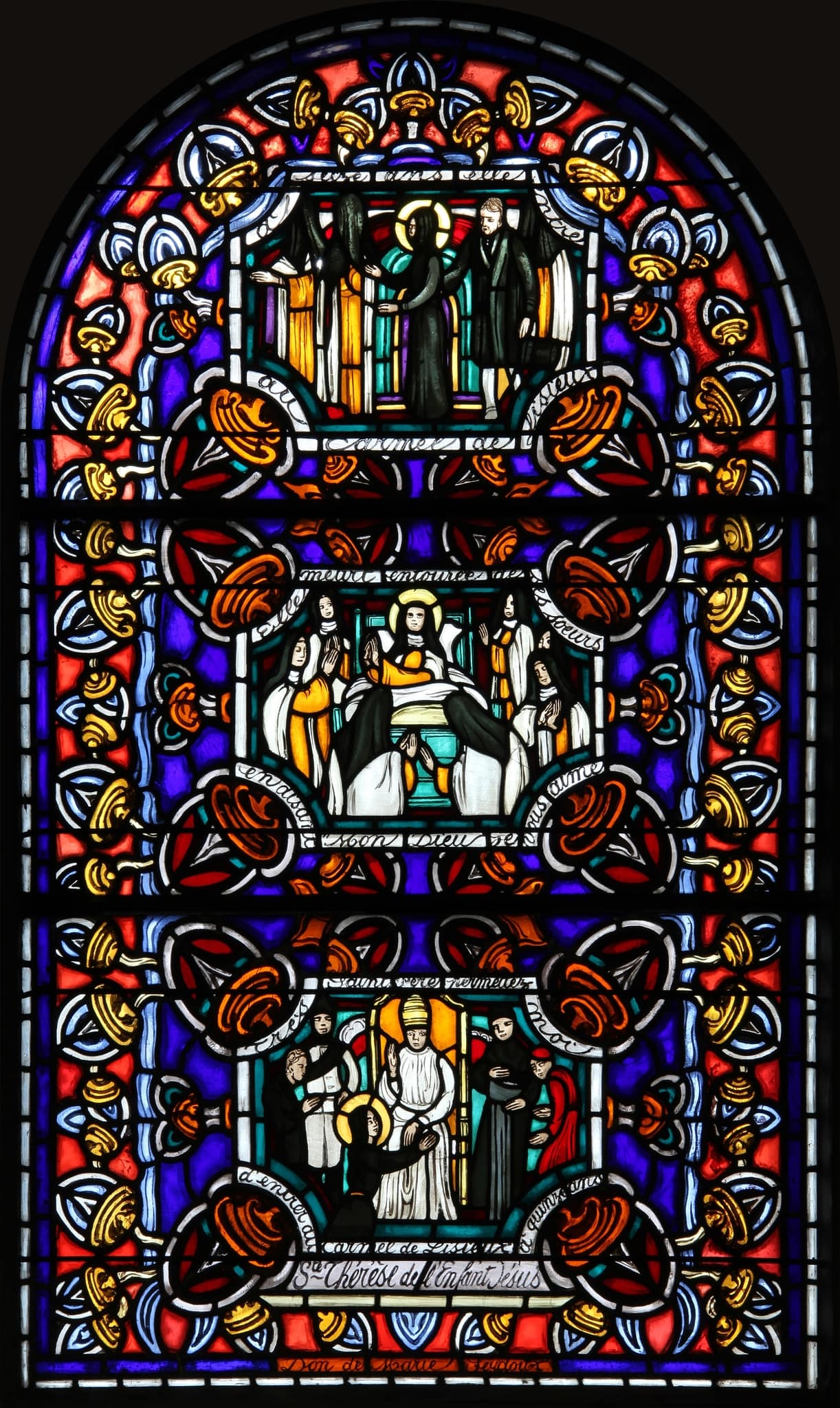 Cette verrière est composée de trois scènes superposées relatant différents épisodes de la vie de sainte Thérèse de Lisieux.