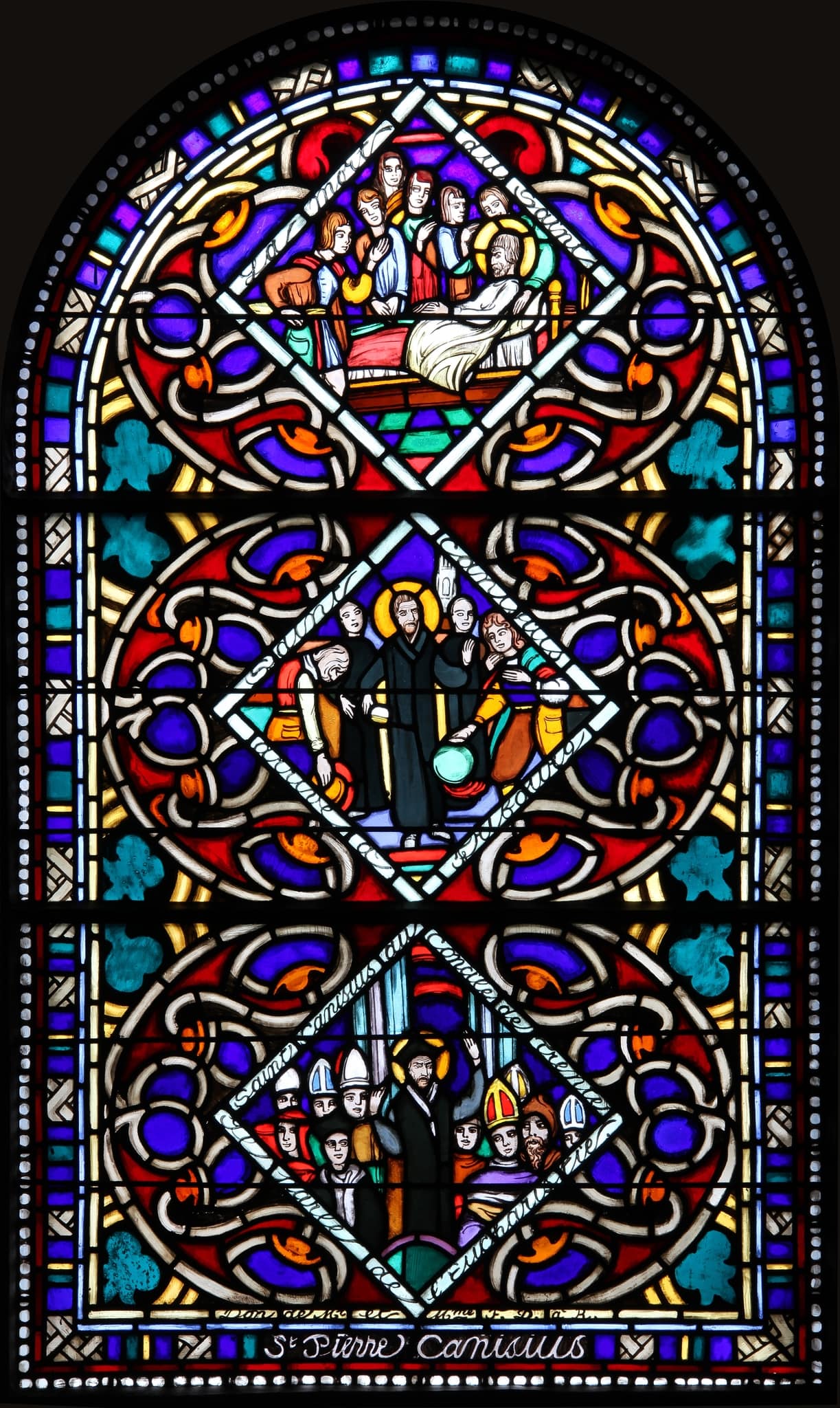 Cette verrière est composée de trois scènes superposées relatant différents épisodes de la vie de Pierre Canisius, inscrits dans des médaillons losangés.