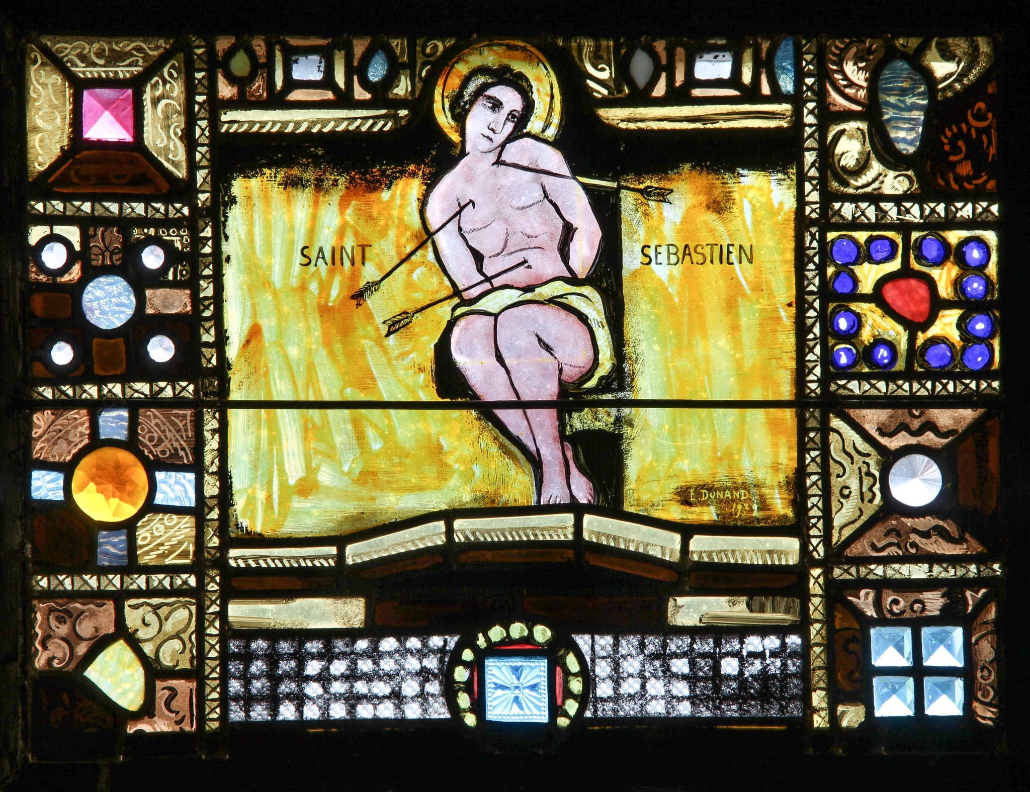 Au centre du vitrail, Sébastien, nimbé, les bras attachés derrière le dos, est assis et se penche légèrement en avant sur le côté, son torse nu percé de trois flèches. Il se détache sur un fond doré, rehaussé de quelques touches orangées.