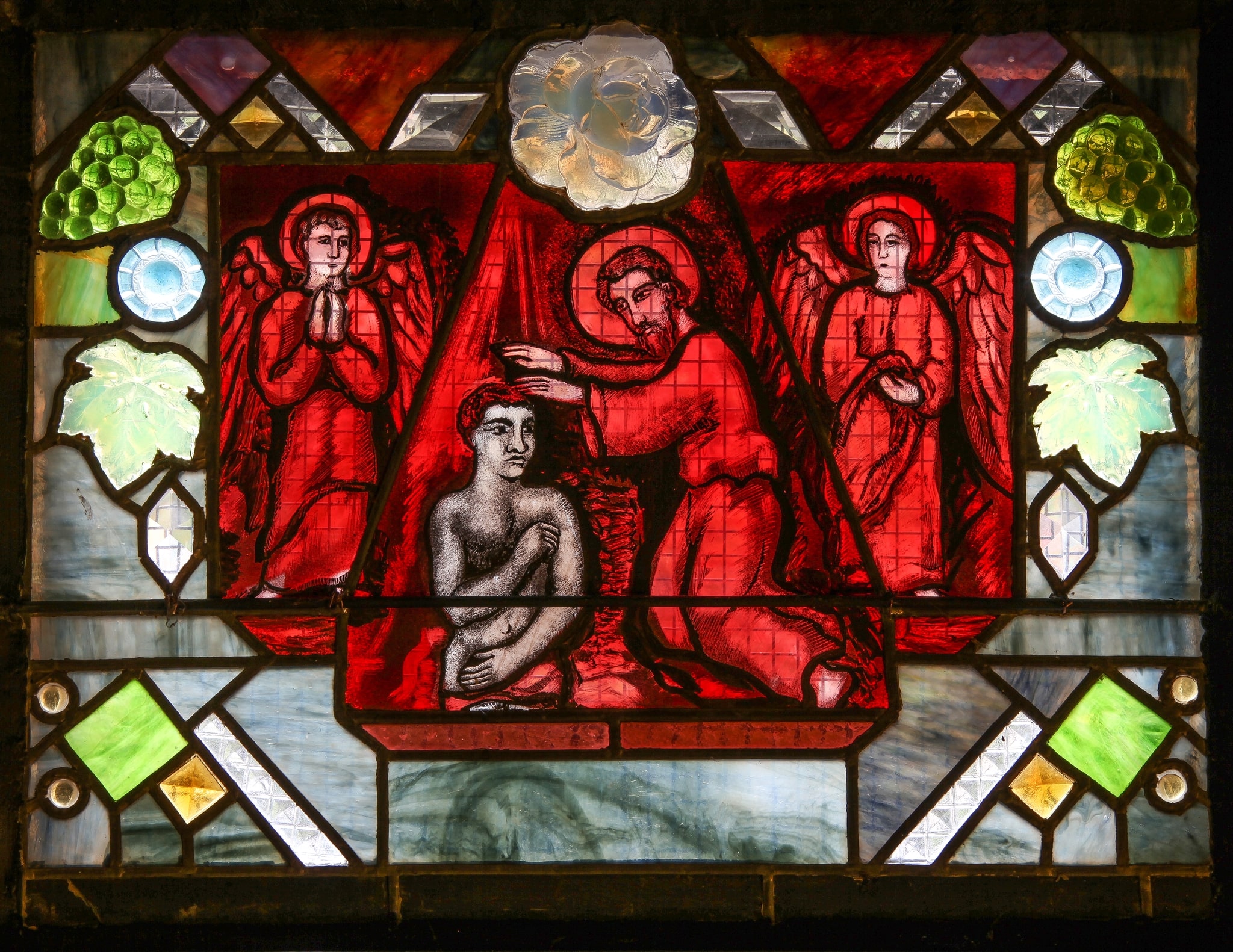 Une large bordure colorée, composée de différents verres industriels, de cabochons et de verres moulés-pressés (grappes de raisin, feuilles de vigne et fleurs) encadre la scène.