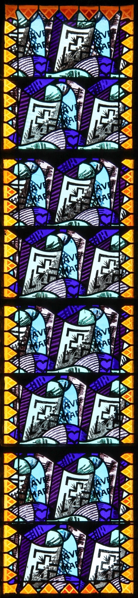 Ce vitrail est composé de huit panneaux décoratifs superposés. S’y déploient en alternance (et se répétant à quatre reprises) un panneau disposé de deux rouleaux avec l’inscription “AVEC MARIA” et une croix encadrée. Ils flottent au milieu d’éléments décoratifs en arc de cercle, sur lesquels figure un coeur. Le tout est composé dans différents tons de bleu.