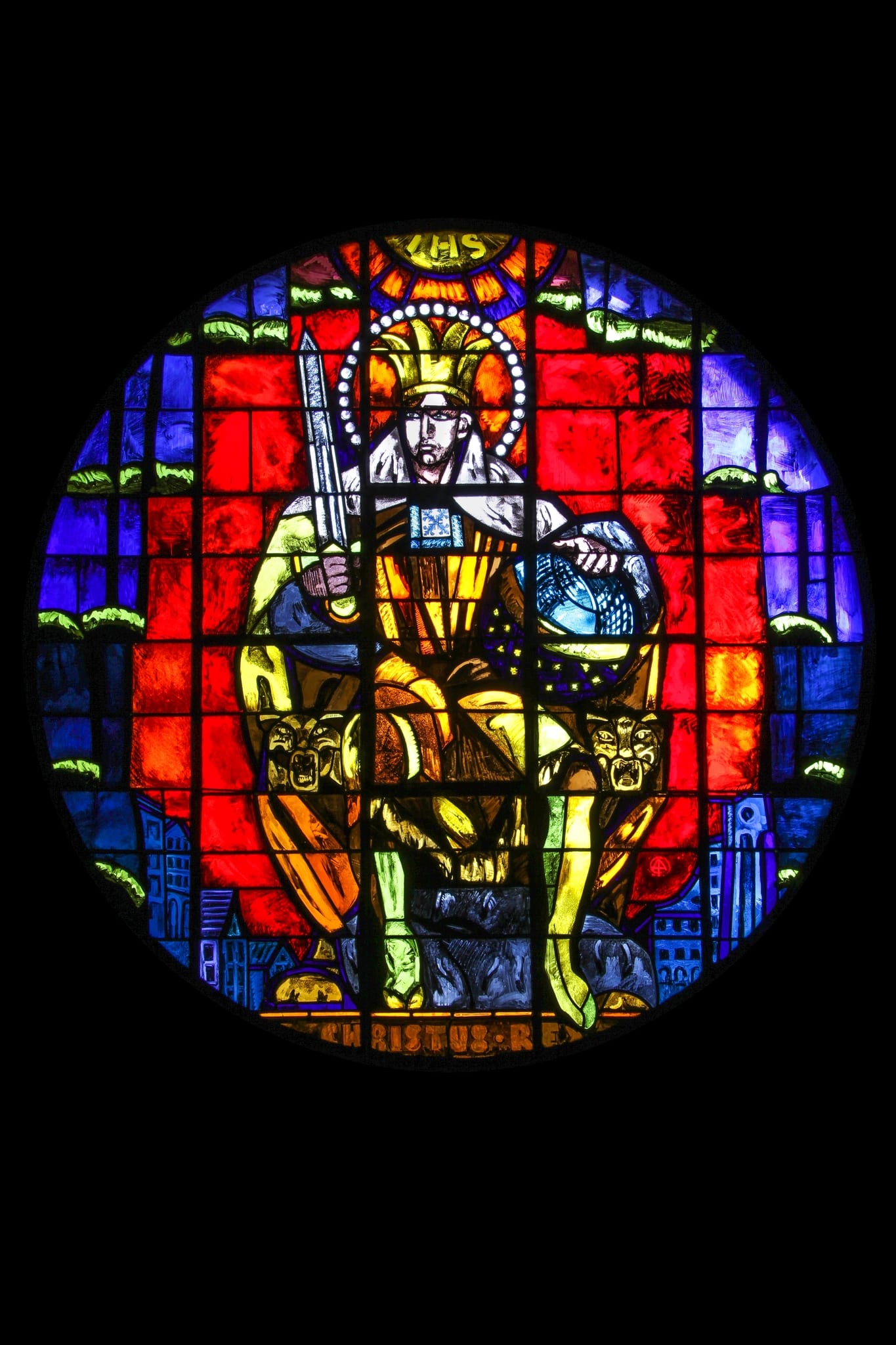 L’architecte de l’église de Finhaut, Fernand Dumas, fait une nouvelle fois appel à Alexandre Cingria pour la décoration et la polychromie intérieures du sanctuaire après leur collaboration à l’église d’Echarlens dans le canton de Fribourg. Placée, comme cette dernière, sous le vocable de Notre-Dame de l’Asssomption, le thème marial est omniprésent dans la décoration du bâtiment, notamment par la récurrence de la teinte bleue. Mais l’identité iconographique de l’église est aussi marquée par le vitrail de rose de la tribune des orgues, représentant le Christ-Roi (Gross, 2006, p. 15-16). Ce sujet c�o�r�r�e�s�p�o�n�d� �p�a�r�f�a�i�t�e�m�e�n�t� �à �l�’e�s�p�r�i�t� �m�i�l�i�t�a�n�t� �q�u�i� �a�n�i�m�e� �l�e� �G�r�o�u�p�e� �d�e� �S�a�i�n�t�-�L�u�c� et c�o�ïn�c�i�d�e� �a�v�e�c� �l�’e�n�c�y�c�l�i�q�u�e� �Quas primas, **a�y�a�n�t� �i�n�s�t�i�t�u�é �l�a� �f�êt�e� �d�u� �C�h�r�i�s�t�-�R�o�i� �en �1�9�2�5�,� �a�f�f�i�r�m�a�n�t� �l�a� �r�o�y�a�u�t�é �n�o�n� �s�e�u�l�e�m�e�n�t� �d�i�v�i�n�e�,� �m�a�i�s� �ég�a�l�e�m�e�n�t� �h�u�m�a�i�n�e� �d�u� �C�h�r�i�s�t�.� �T�r�ès� �a�p�p�r�éc�i�ée� �p�a�r� �C�i�n�g�r�i�a�,� �c�e�t�t�e� �t�h�ém�a�t�i�q�u�e� �p�e�r�m�e�t� �à �l�’a�r�t�i�s�t�e� �d�e� �p�o�u�s�s�e�r� �à �s�o�n� �p�a�r�o�x�y�s�m�e� �l�’i�m�b�r�i�c�a�t�i�o�n� �e�n�t�r�e� �l�a� �f�i�g�u�r�e� �d�u� �r�o�i�,� �d�u� �g�u�e�r�r�i�e�r� �e�t� �d�u� �d�i�e�u� �(Noverraz, 2022, p. 324). Monumentale par sa taille, cette verrière l’est aussi par l’impression de force que dégage ce Christ, trônant devant une ville sombrant dans la nuit. L’artiste reprend ce thème l’année suivante pour l’un des vitraux du choeur de l’église de Lutry. Alors que le Christ s’y présente en tant que monarque, à Finhaut il est un soldat conquérant.