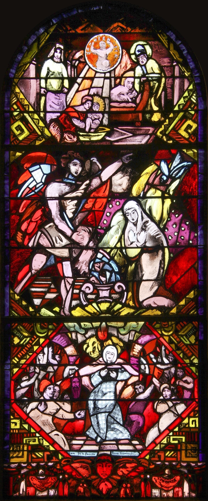 Cette verrière est composée de trois scènes superposées inscrites dans des losanges, relatant différents épisodes de la vie de la Vierge.