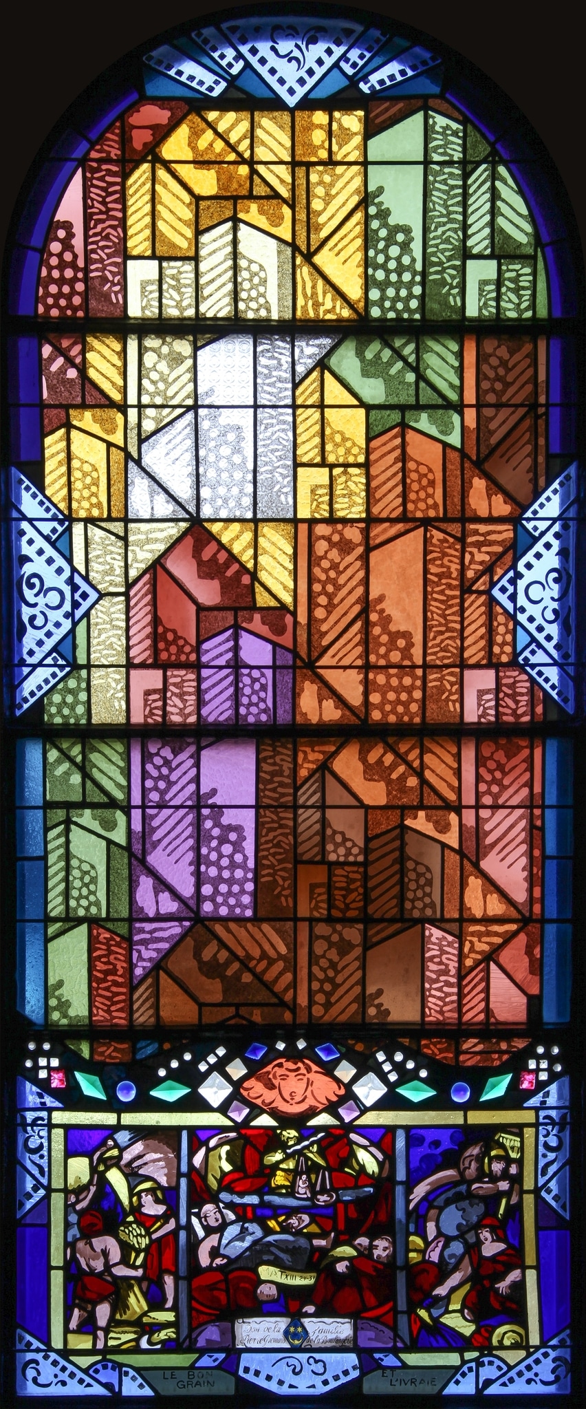 Une guirlande multicolore de cabochons et verres structurés sépare les deux secteurs, avec au centre une tête d’ange ailé inscrite dans un losange.