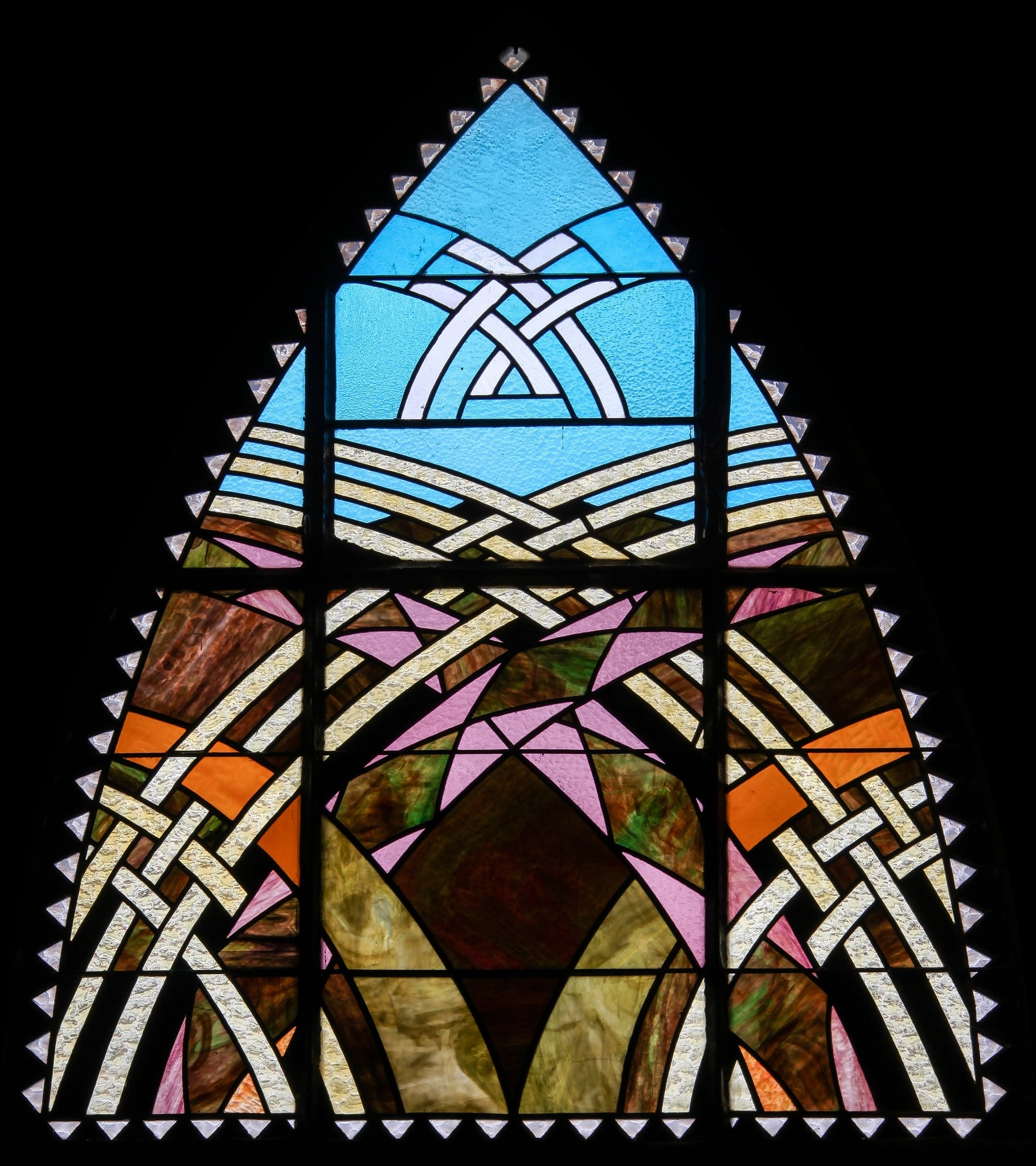 Pour ces verrières situées sur la paroi nord de la nef, Cingria opte pour des vitraux ornementaux de style Art déco, dans lesquels il utilise différents types de verres industriels aux textures diverses et à différents niveaux d’opacité. L’artiste trouve ces verres dans l’atelier lausannois Chiara, avec lequel il entretient une collaboration privilégiée depuis 1926 (“Vitraux d’art exécutés par la maison Chiara de Lausanne [...]”, 1931). Il y décline un motif d’arc en tiers-point que l’on retrouve partout dans l’édifice : dans la forme des baies et de l’arc triomphal, sur les décors peints des caissons du plafond, sur le garde-corps de la tribune des orgues, sur le maître-autel, etc.