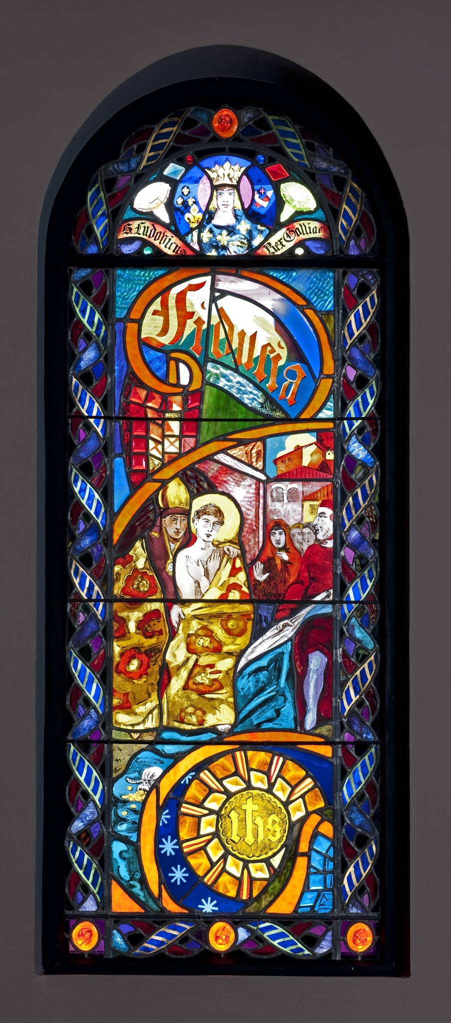 En haut, dans un médaillon, le jeune roi de France, Louis IX, nimbé et coiffé d’une couronne, porte une cape fleuredelisée et tient un globe et un sceptre. De part et d’autre de sa tête figurent les armoiries des rois de France et l’emblème franciscain. De chaque côté du médaillon apparaît une fleur en verre moulé-pressé (jaune à gauche, verte à droite), ainsi que des cabochons de différentes formes et couleurs. Un phylactère avec le nom du saint se déploie sous le médaillon.