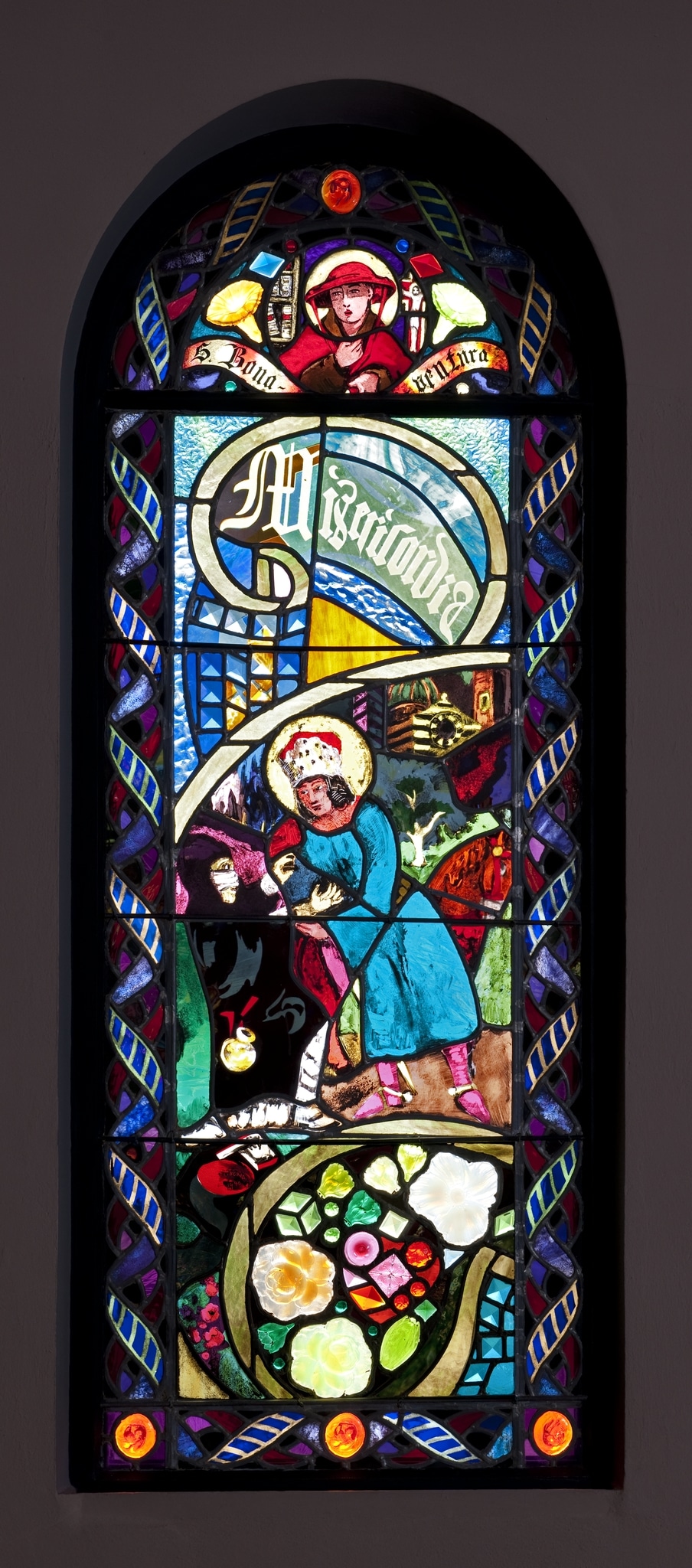 Le panneau central de cette fenêtre, illustrant l’épisode du Baiser de François d’Assise au lépreux est l’une des deux nouvelles scènes créées en 1940 lors de la réalisation du nouveau cycle de verrières. Frère Gabriel-Marie lui a associé en médaillon saint Bonaventure, qui surplombait initialement les scènes de François entendant la voix du crucifix de Saint-Damien et la Rupture entre François d’Assise et son père, Pierre Bernardone, et souhaitait le voir représenté en habit de cardinal (Charrière, [1932]g). Lors de l’analyse des projets, frère Gabriel-Marie avait trouvé le dessin du saint très bon (Charrière, 1932c, 17 février).