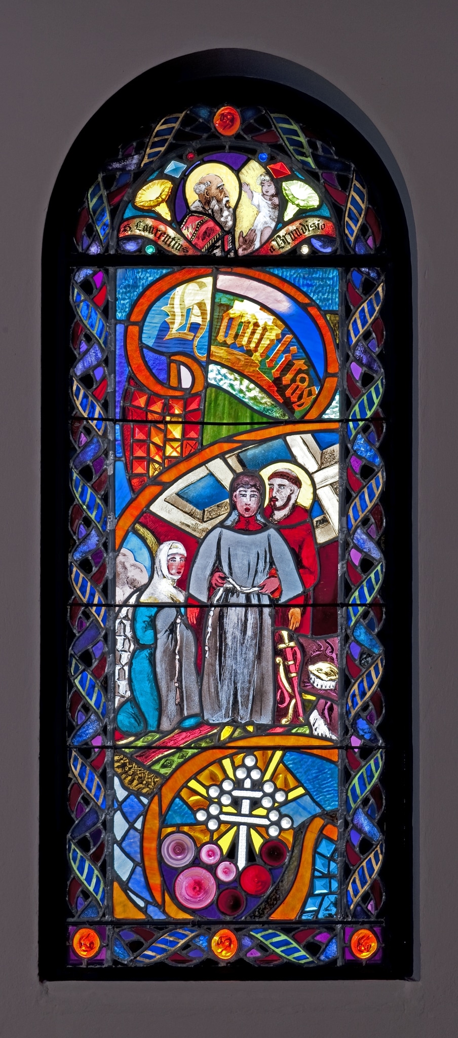 Le panneau central de cette fenêtre, illustrant l’épisode de saint François d’Assise revêtant Lucchese, le premier tertiaire, était en 1932 associé à la scène de sainte Claire accueillie par François d’Assise (GSL_164). Ce vitrail comporte dans le médaillon supérieur saint Laurent de Brindisi, qui se trouvait à l’origine au-dessus des scènes du Pardon de la Portioncule et de la Fête de Noël à Greccio. Frère Gabriel-Marie avait souhaité le voir représenter avec l’apparition de l’Enfant Jésus (Gabriel-Marie, [1932]g).