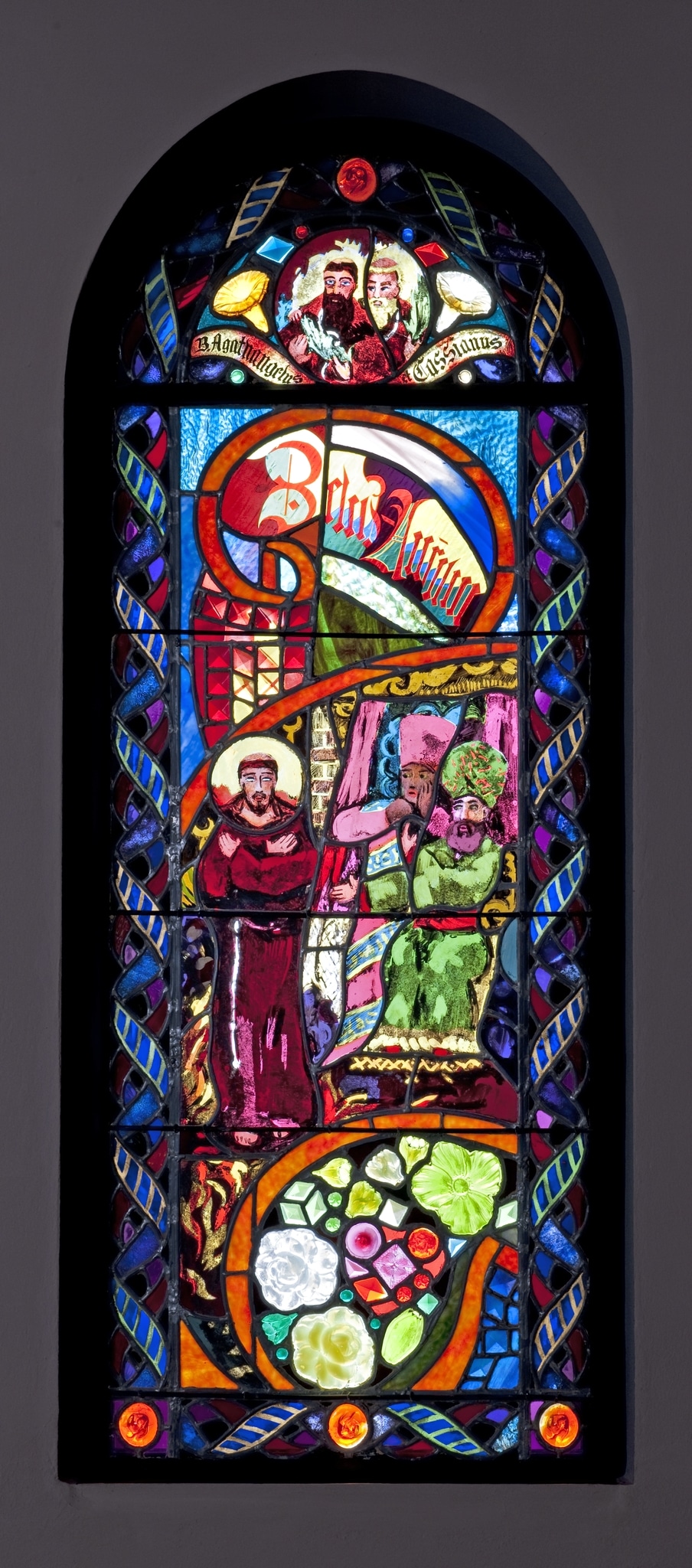 Le panneau central de cette fenêtre, illustrant l’épisode de la rencontre sans arme de François d’Assise avec le sultan est l’une des deux scènes créées en 1940 lors de la réalisation du nouveau cycle de verrières. Frère Gabriel-Marie lui a associé en médaillon les bienheureux Agathange et Cassien, également une création de 1940.
