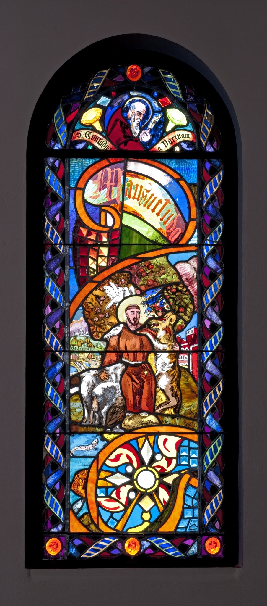 Ce vitrail a été réalisé par l’artiste genevois Alexandre Cingria et l’atelier Chiara de Lausanne pour la nef de la chapelle de l'Hôtellerie franciscaine de Saint-Maurice.