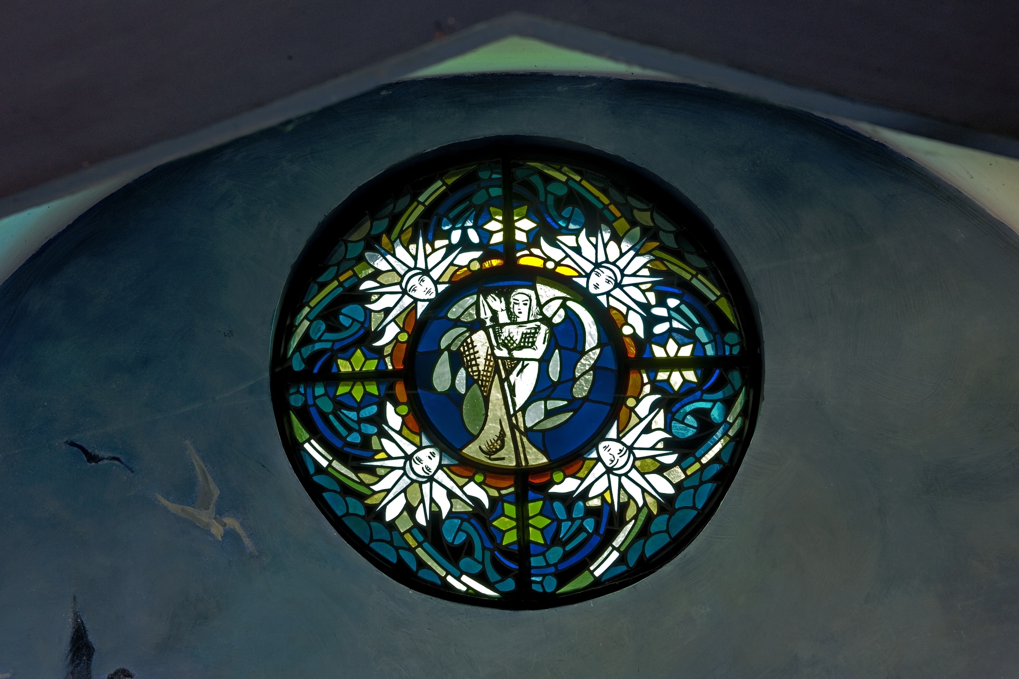 Ce vitrail a été réalisé par l’artiste genevois Alexandre Cingria et l’atelier Chiara de Lausanne pour l’une des sept ouvertures de la coupole surmontant le choeur hémisphérique dde la nouvelle chapelle de l'Hôtellerie franciscaine à Saint-Maurice (ancien scolasticat puis Foyer franciscain), édifiée en 1940 par l’architecte romontois Fernand Dumas, également auteur de la restauration de l’ancienne chapelle entre 1929 et 1932.