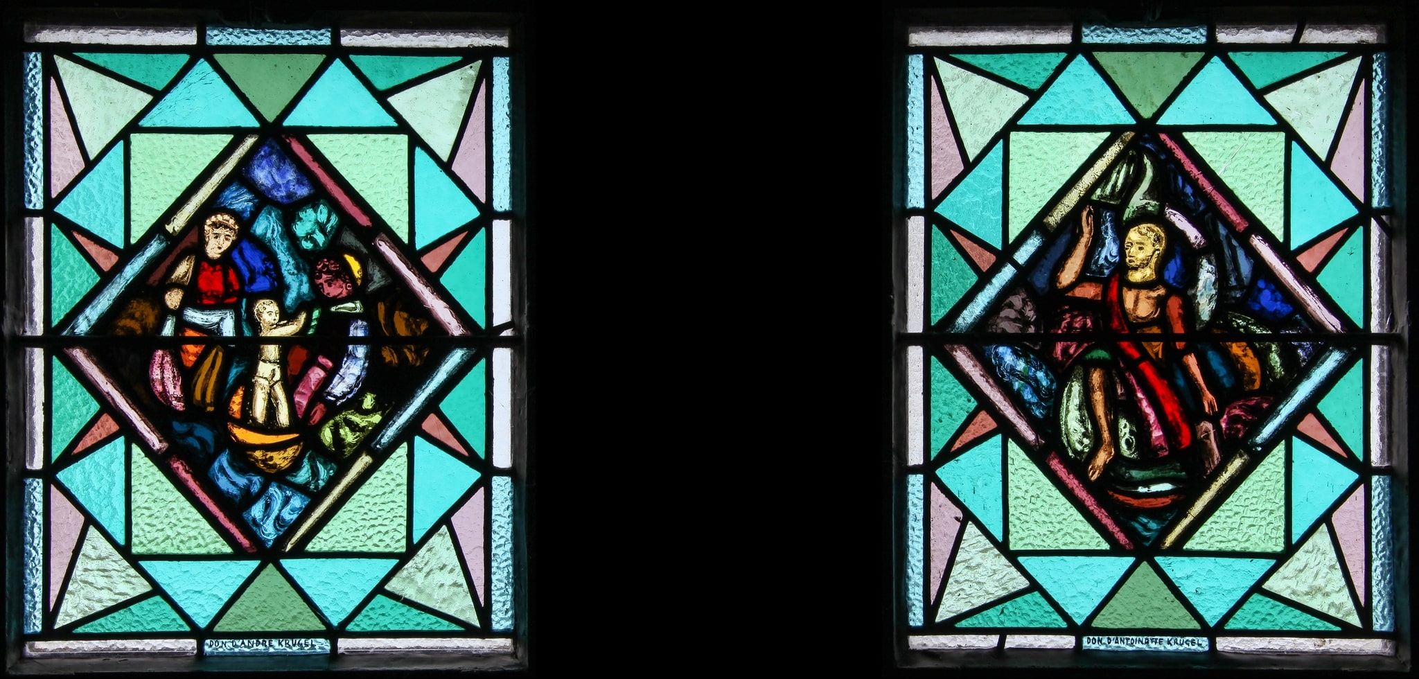 Ces deux petits vitraux situés dans le baptistère de l’église Saint-Joseph de Travers ont été réalisés en 1939 par l’artiste Paul Landry et l’atelier Chiara de Lausanne.