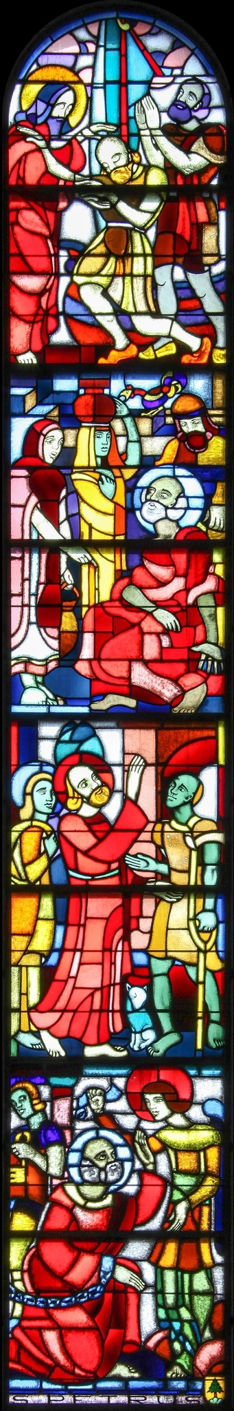 Ce vitrail se compose de quatre scènes relatant différents épisodes de la vie de saint Pierre avec, de haut en bas :