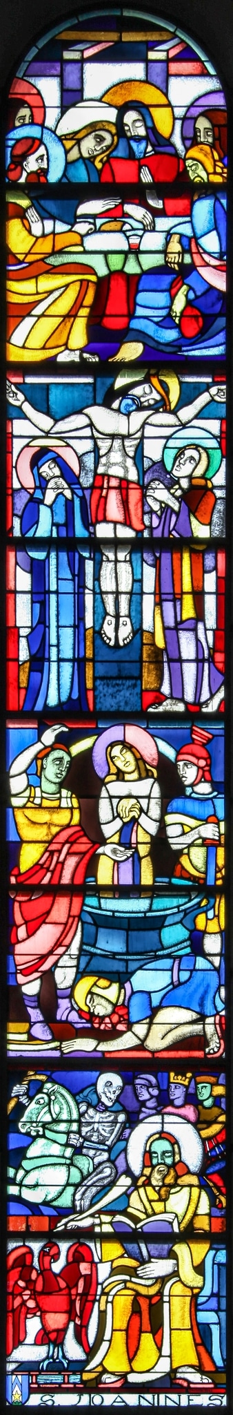 Ce vitrail se compose de quatre scènes relatant différents épisodes de la vie de saint Jean avec, de haut en bas :
