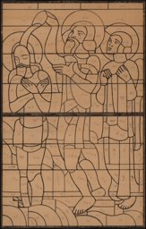 Le fonds graphique de l’atelier Kirsch & Fleckner, conservé au Vitrocentre Romont, possède quatre cartons pour cette fenêtre (KF_1030 ; KF_1044 ; KF_1045 et KF_1046). Les trois projets pour les scènes supérieures sont en noir et blanc, alors que celui pour la scène du bas est en couleur. Ces différences de traitement sont étonnantes, mais nous pouvons supposer que l’artiste ne ressentait pas la nécessité d’apposer la couleur sur chacun des cartons, puisqu’il pouvait s’appuyer sur ses maquettes qui étaient pour la plupart déjà des compositions définitives. Le Vitromusée possède une des maquettes pour ce vitrail (VMR_1033), illustrant la scène du prêche de Jean-Baptiste. Contrairement à la majeure partie des dessins préparatoires qui montrent un état définitif autant de la composition que des couleurs, celle-ci présente encore les tâtonnements de l’artiste sur les deux niveaux. Sur la verrière, il a épuré son dessin et remplacé la dominance jaune par un équilibre des contrastes entre coloris chauds et froids, qui apportent plus d’assise à la scène mais aussi à l’ensemble de la verrière.